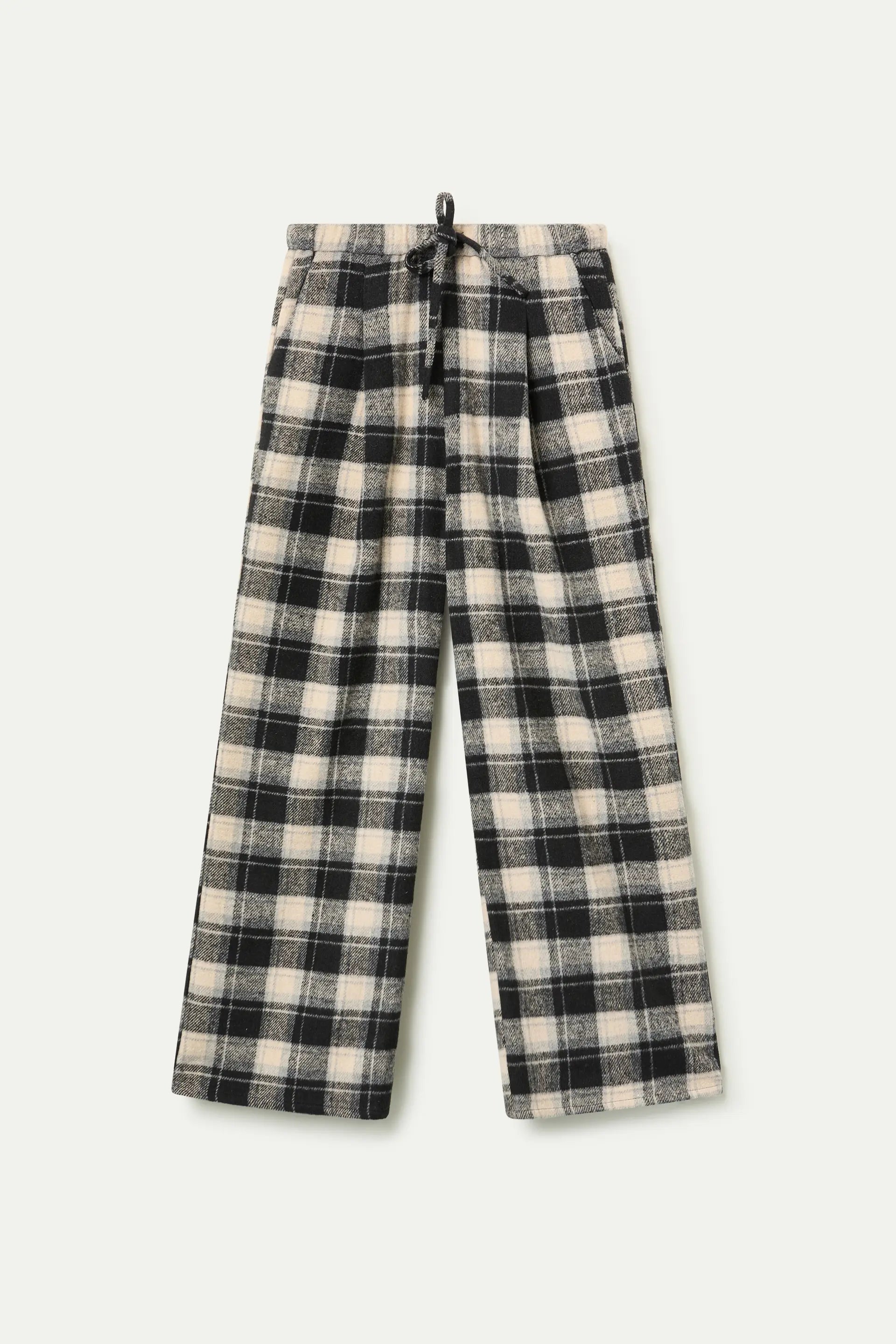 Black check print trousers. Featuring a mid-rise, fixed elastic waistband and a straight leg. Adjustable drawstring. The model is 177 cm tall and is wearing a size S.