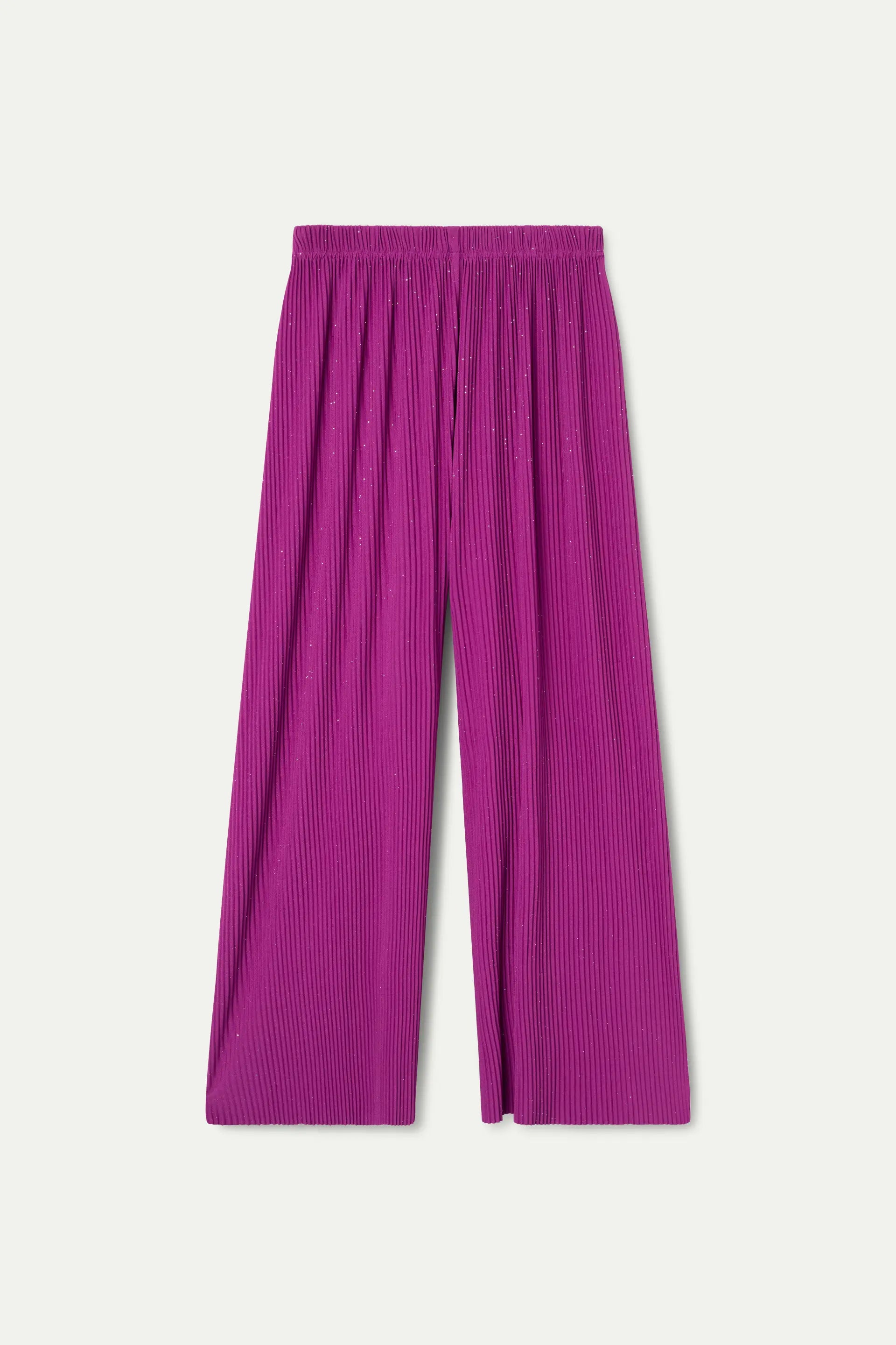 Magenta pleated crepe trousers with lurex details. Featuring a mid-rise, fixed waist with elastic and a straight leg. Adjustable drawstring. The model is 177 cm tall and is wearing a size S.