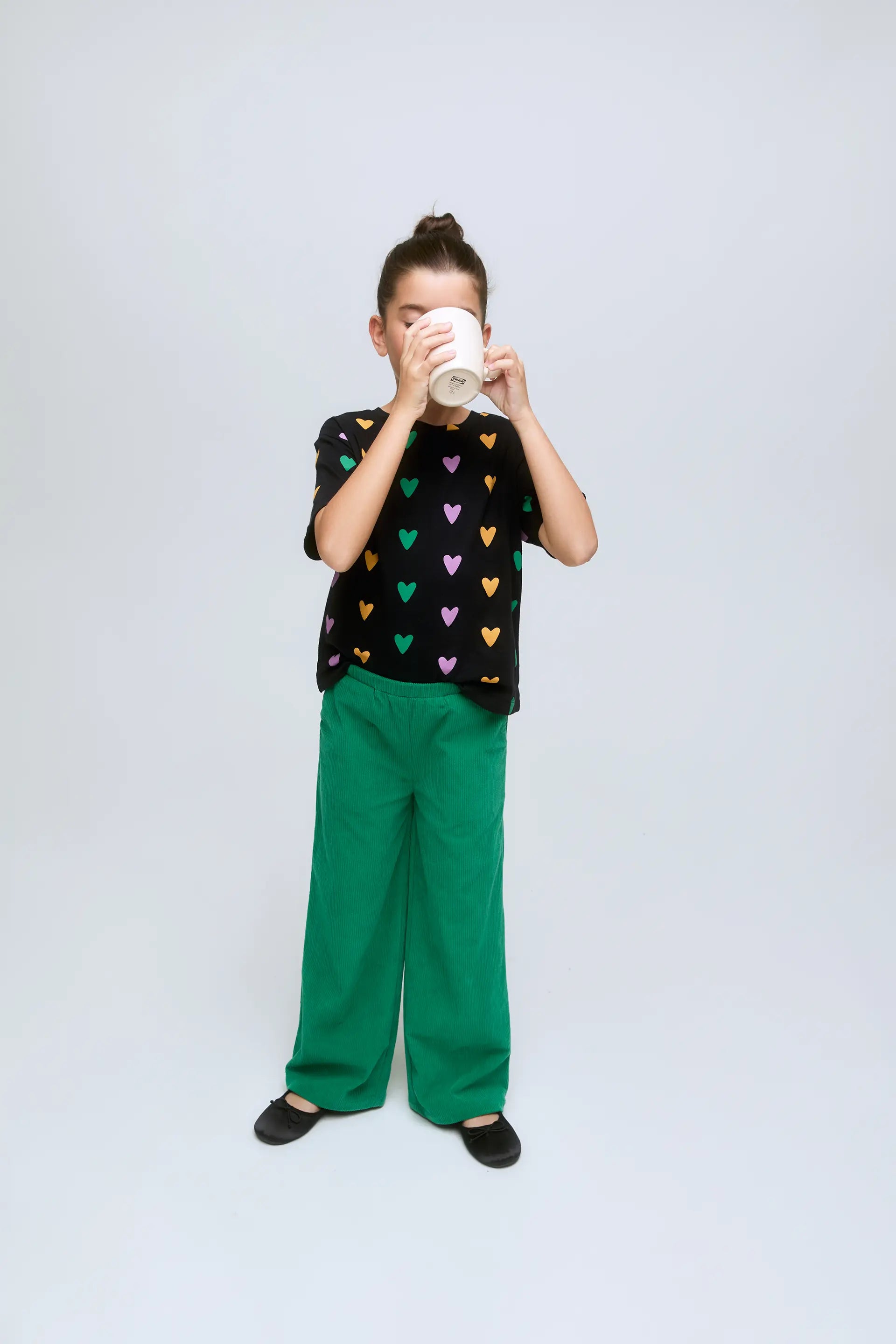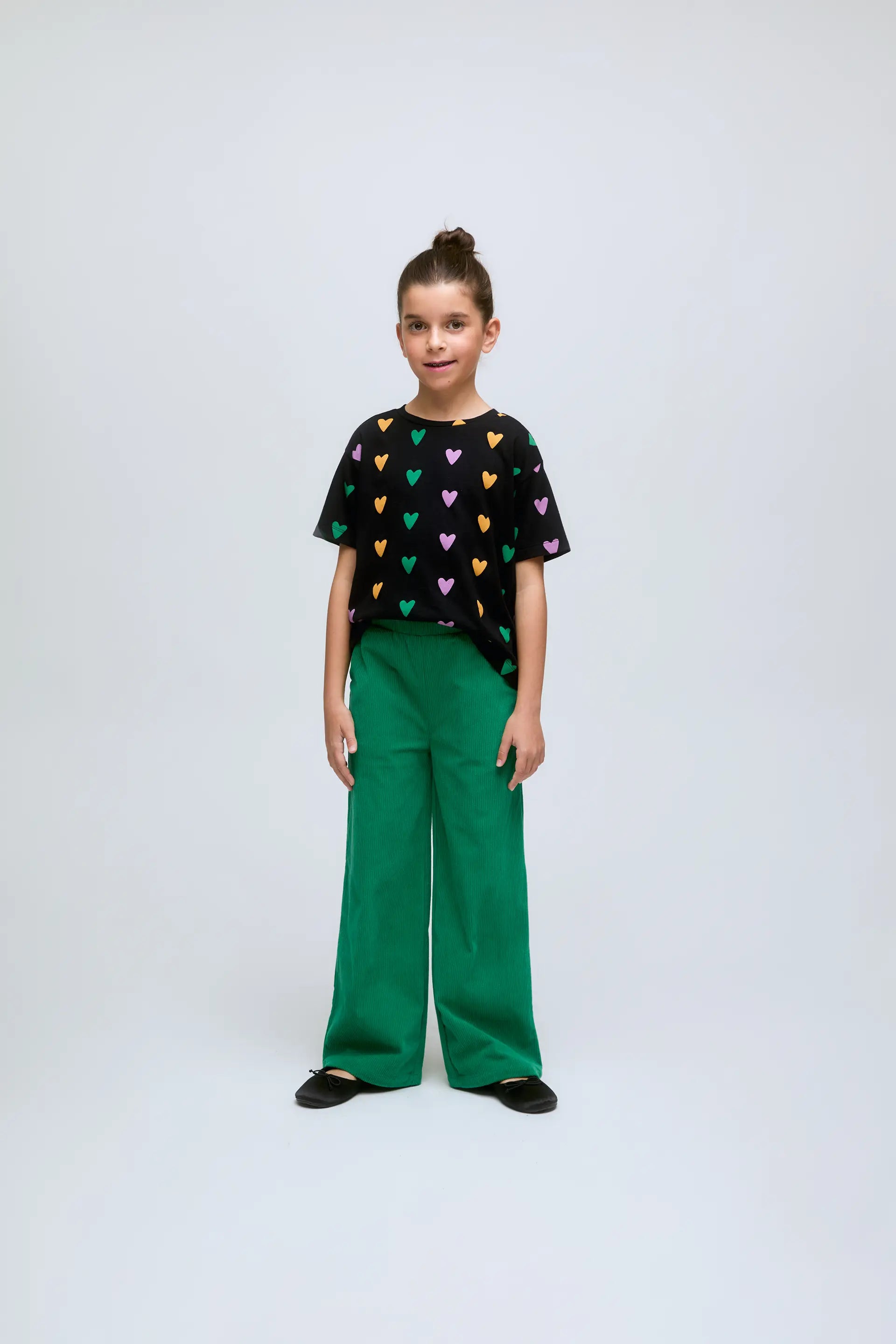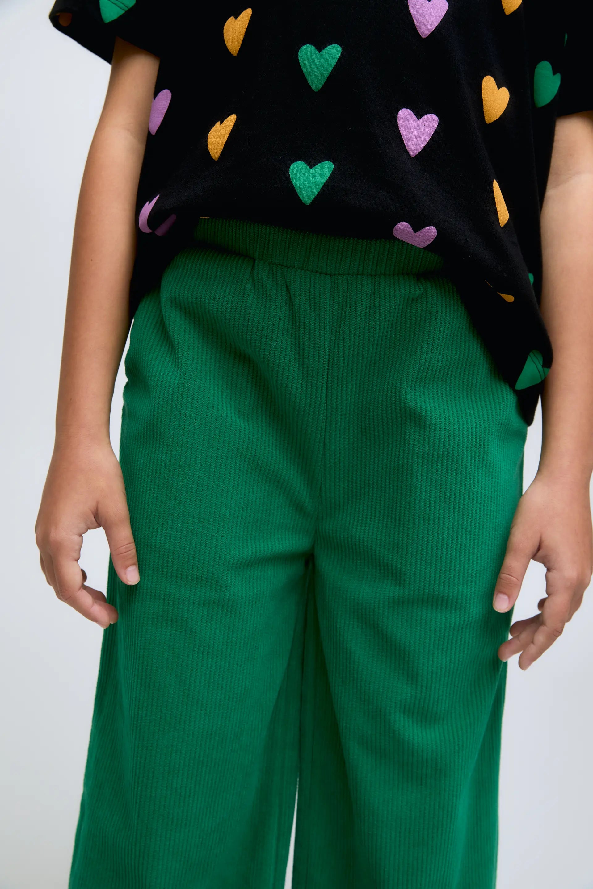 Girls' long trousers made of green cotton corduroy. Wide-leg design with an elastic waistband and side pockets.