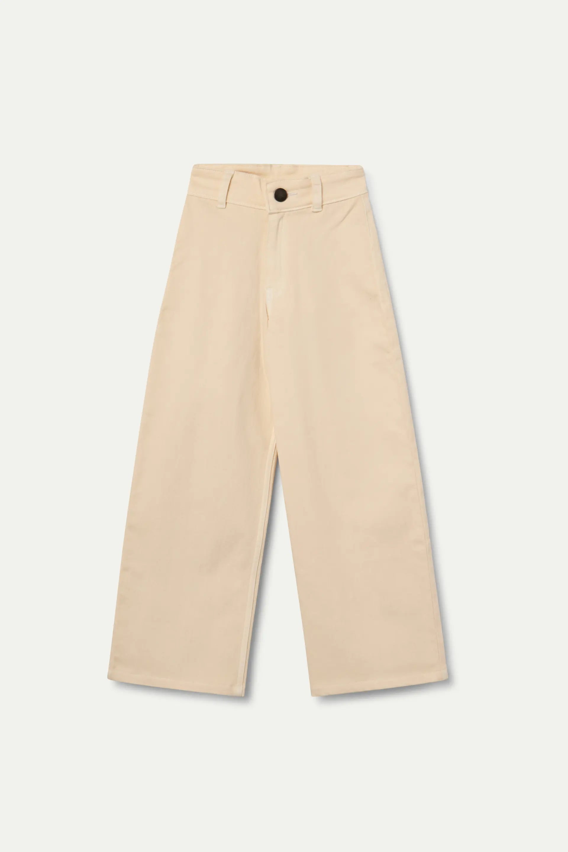 Girls' beige wide-leg pants with pockets and a fitted waist. They feature a belt loop and button closure.