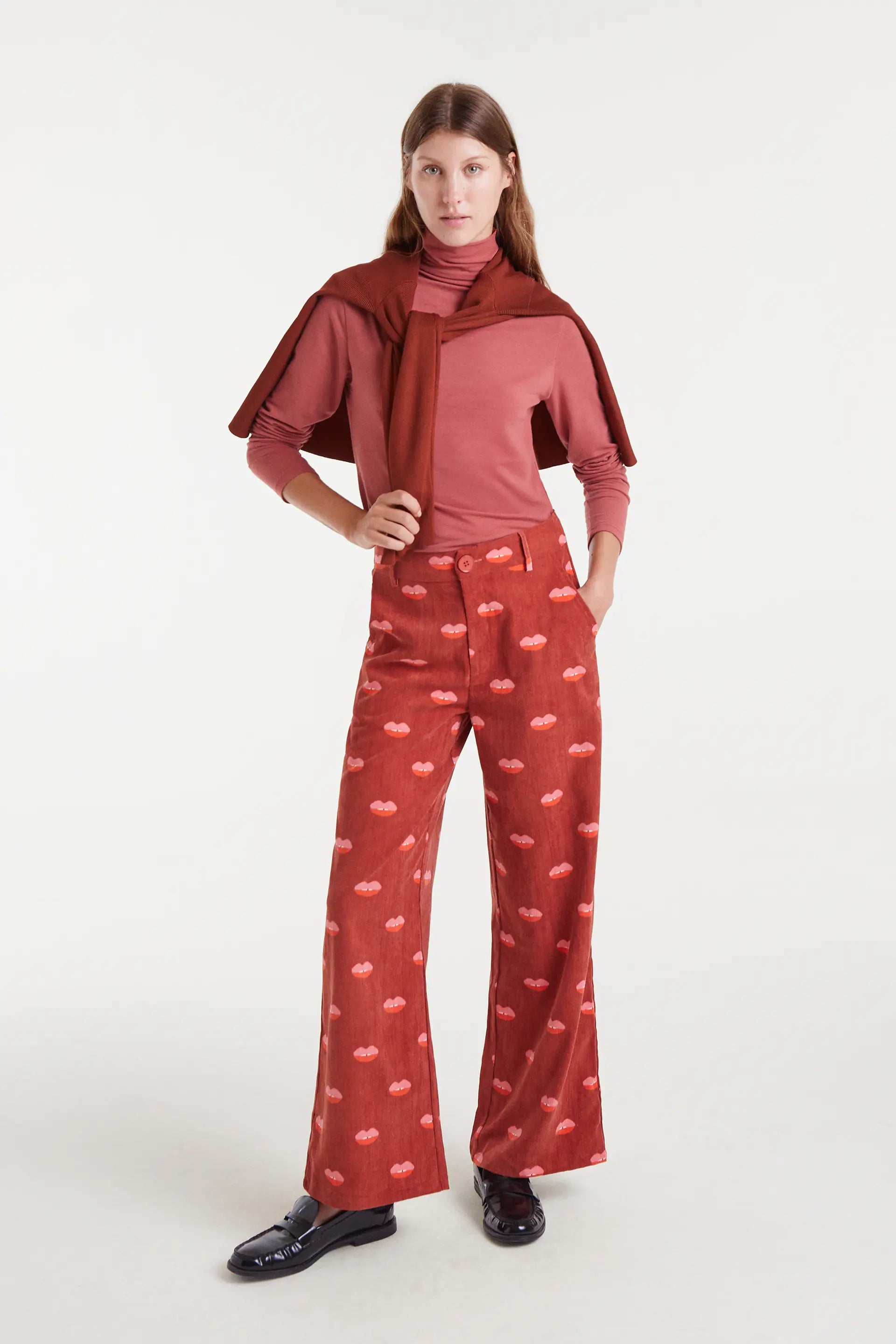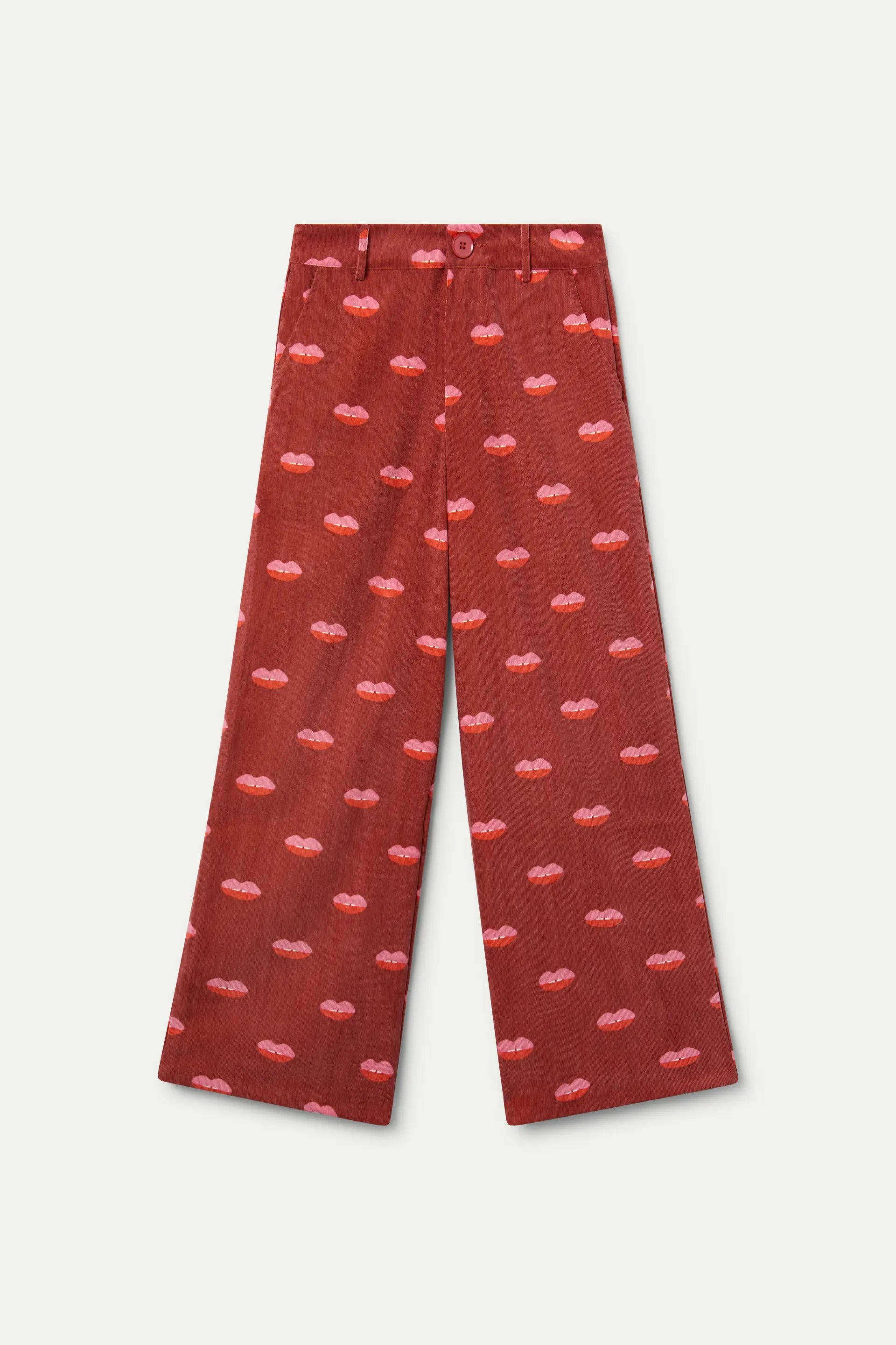 Lips print corduroy trousers. Featuring a mid-rise, fixed waist and a straight leg. Front zip and metal button closure. Side pockets. The model is 177 cm tall and is wearing a size S.