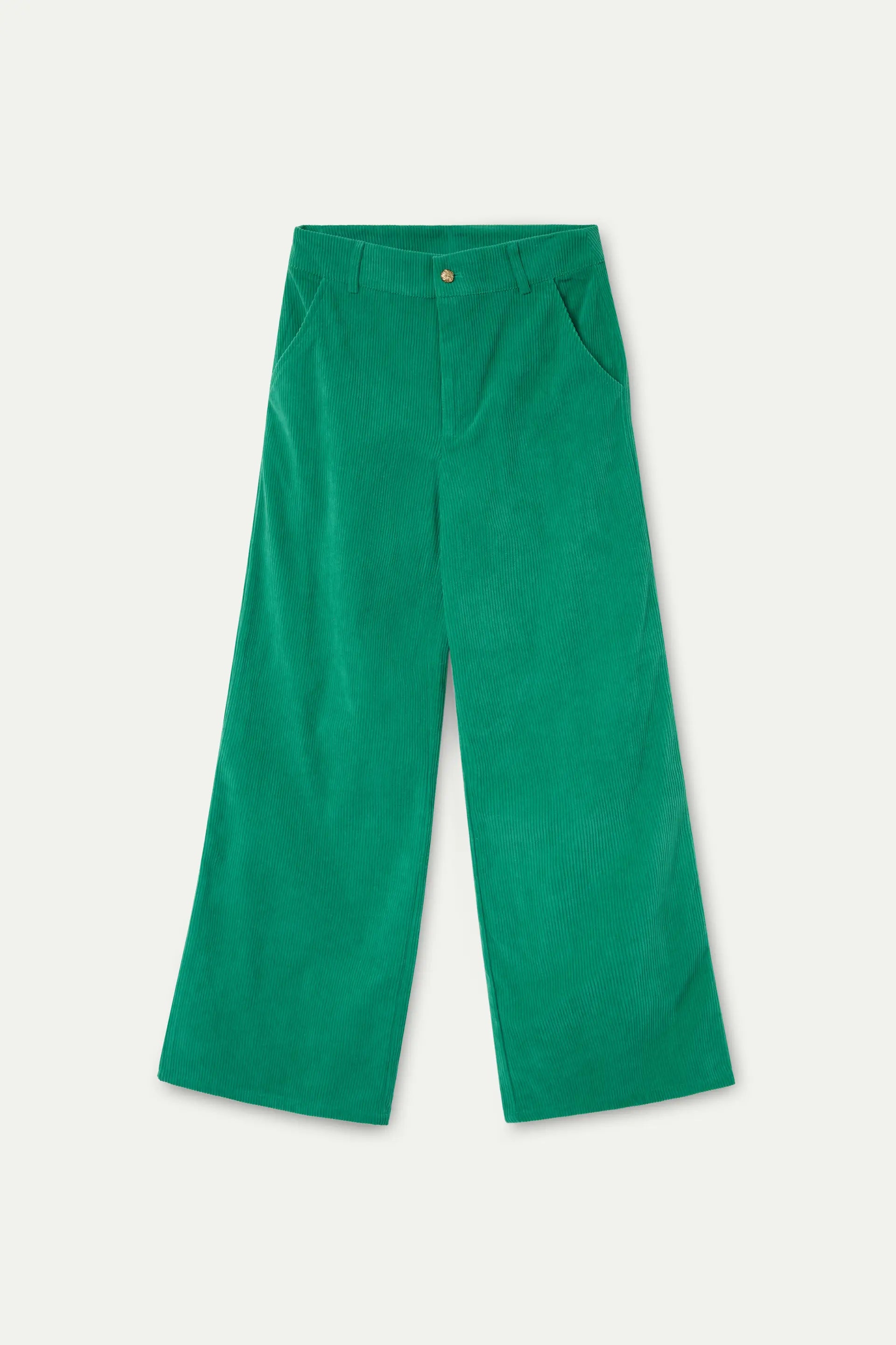 Green corduroy trousers with a mid-rise, fixed waist and straight leg. Front zip and metal button closure. Side pockets. The model is 177 cm tall and is wearing a size S.