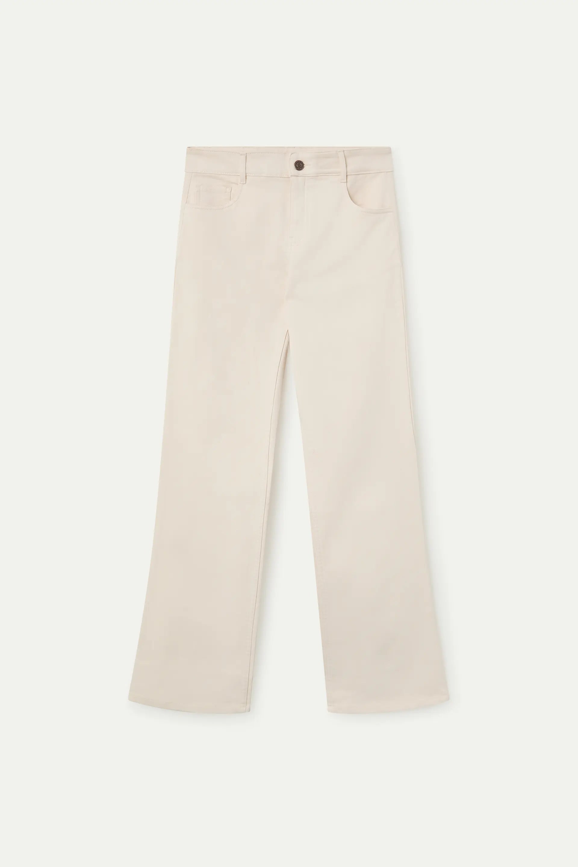 White denim trousers. High-waisted, straight leg. Front zip and button fastening. Side and back pockets. The model is 175 cm tall and wears size S.