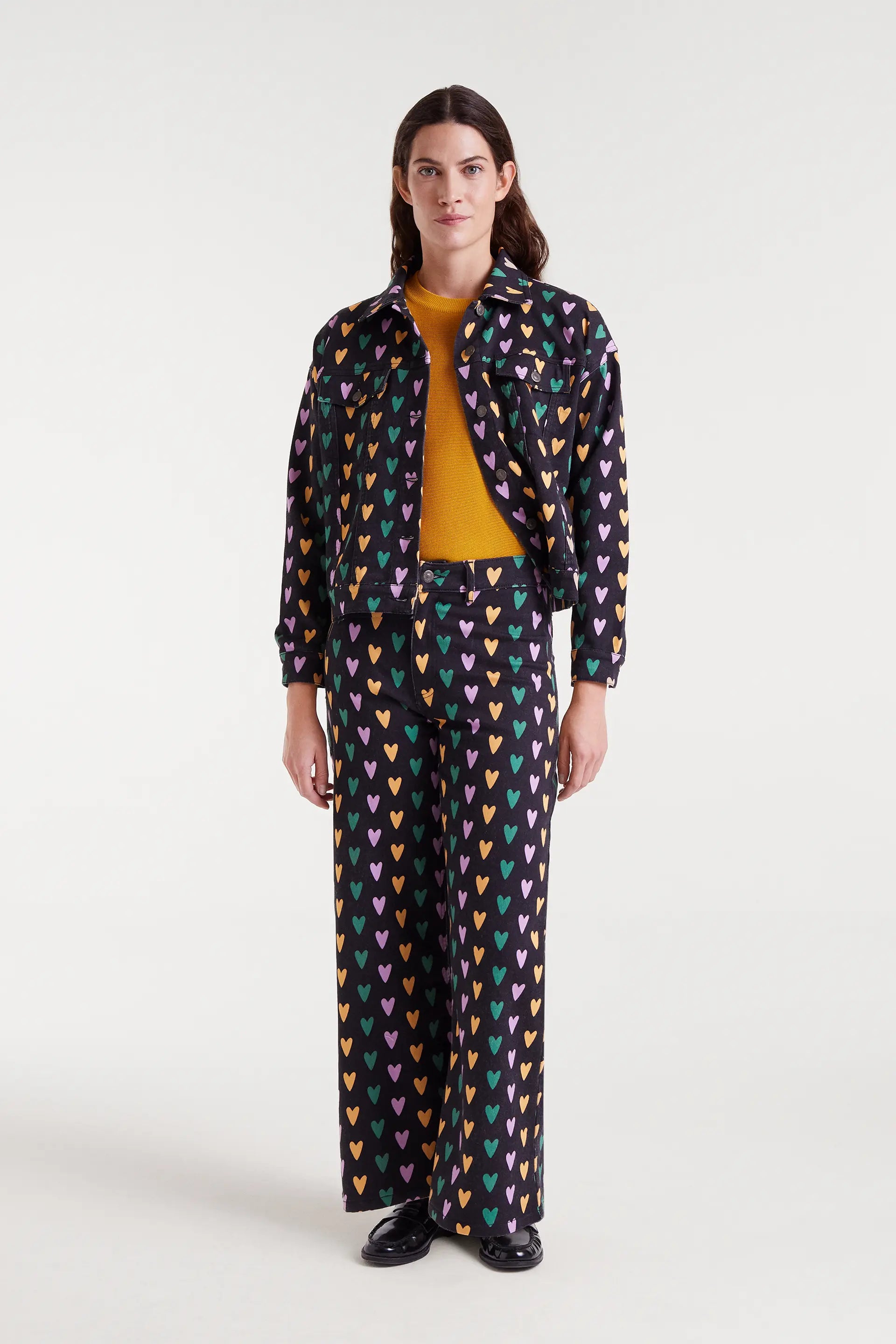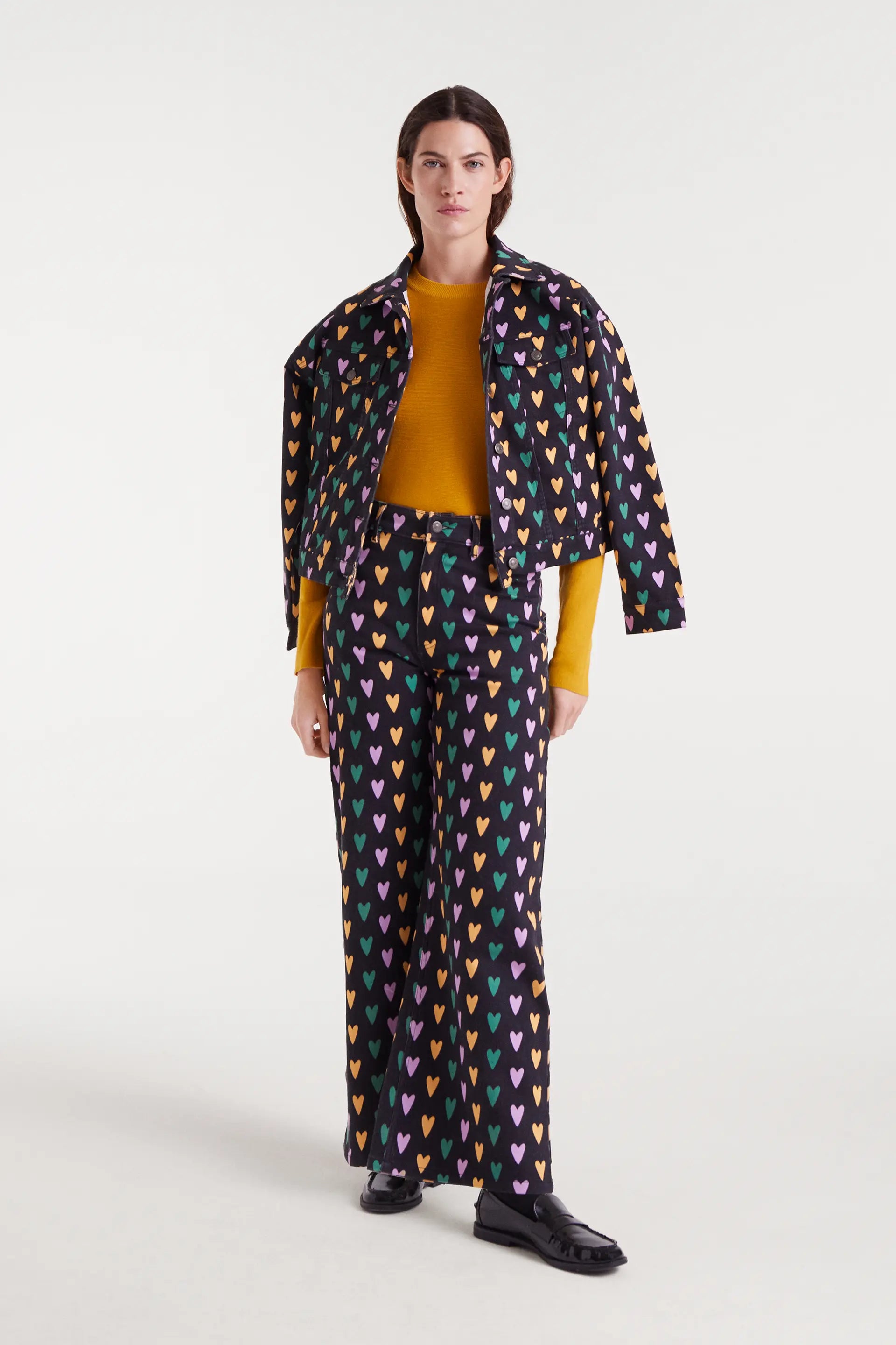 Stretch denim jeans with a Cupid Lines print. Mid-rise and straight leg. Front zip and button fastening. Side and back pockets. The model is 177 cm tall and wears size S.