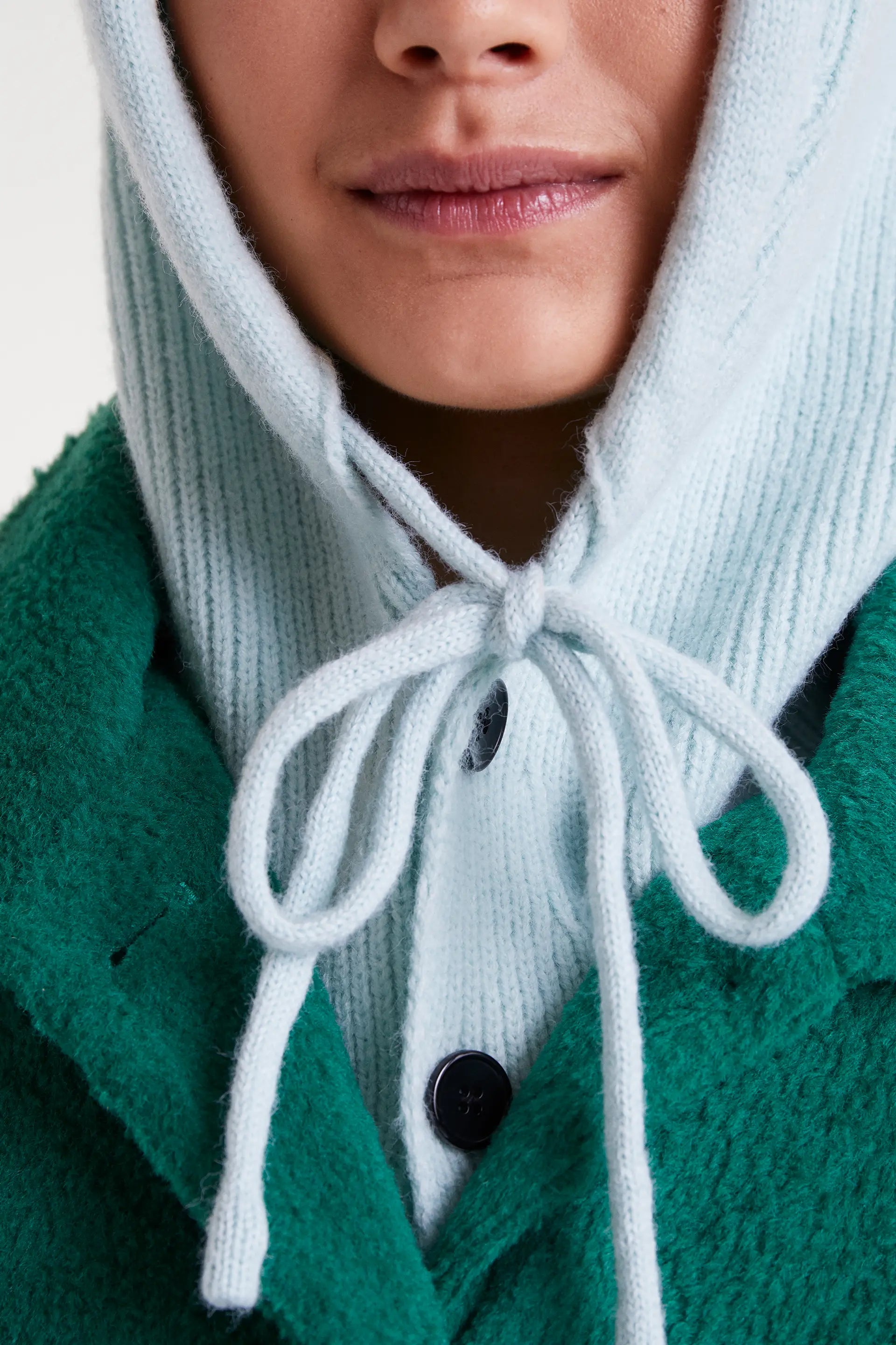 Fine-knit balaclava in blue. With adjustable drawstring and button detailing. One size fits most.