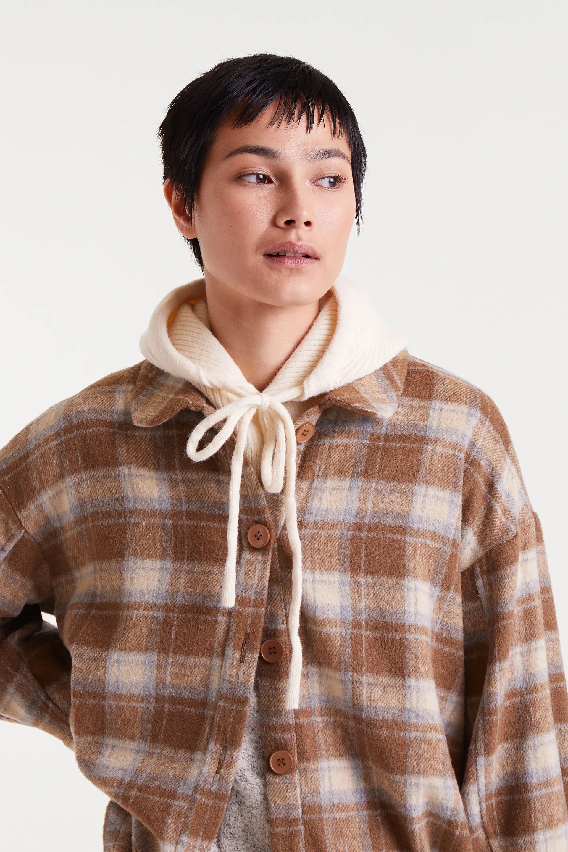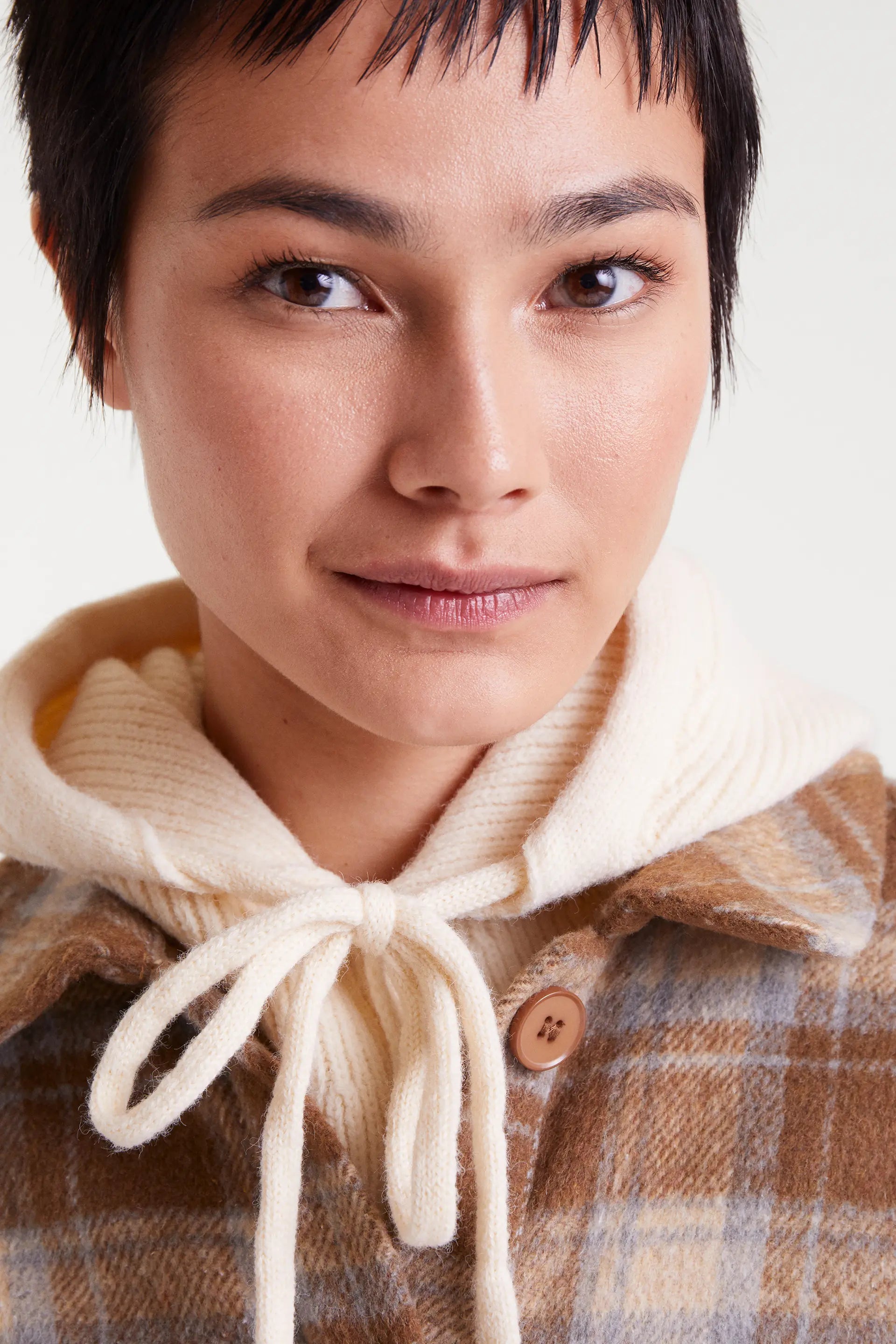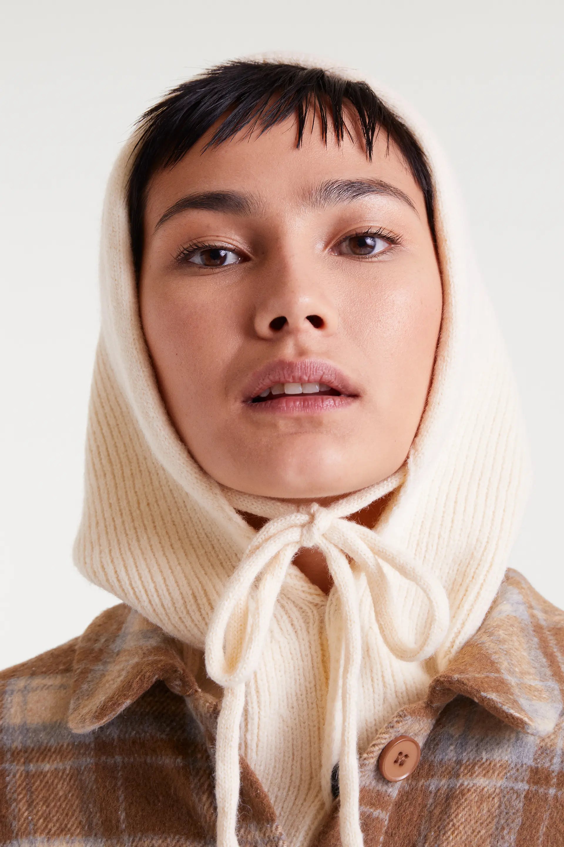 Balaclava with fine white knit fabric. With adjustable drawstring and button detailing. One size fits most.