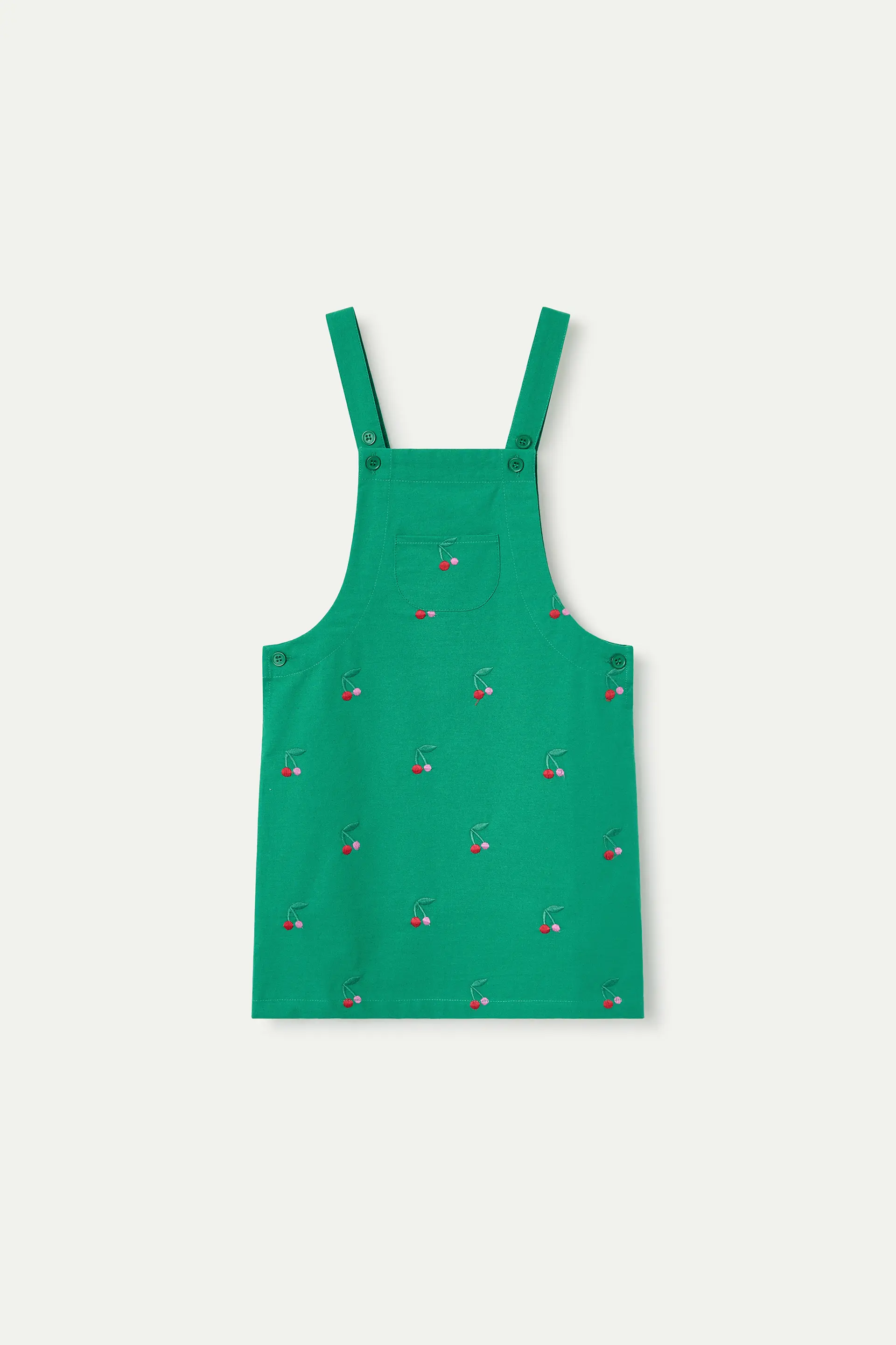 Girls' pinafore dress in 100% cotton, green with a cherry print. Square neckline and thick straps with green button closure. Front pocket. The model is 127 cm tall and wears size 8-9 years.