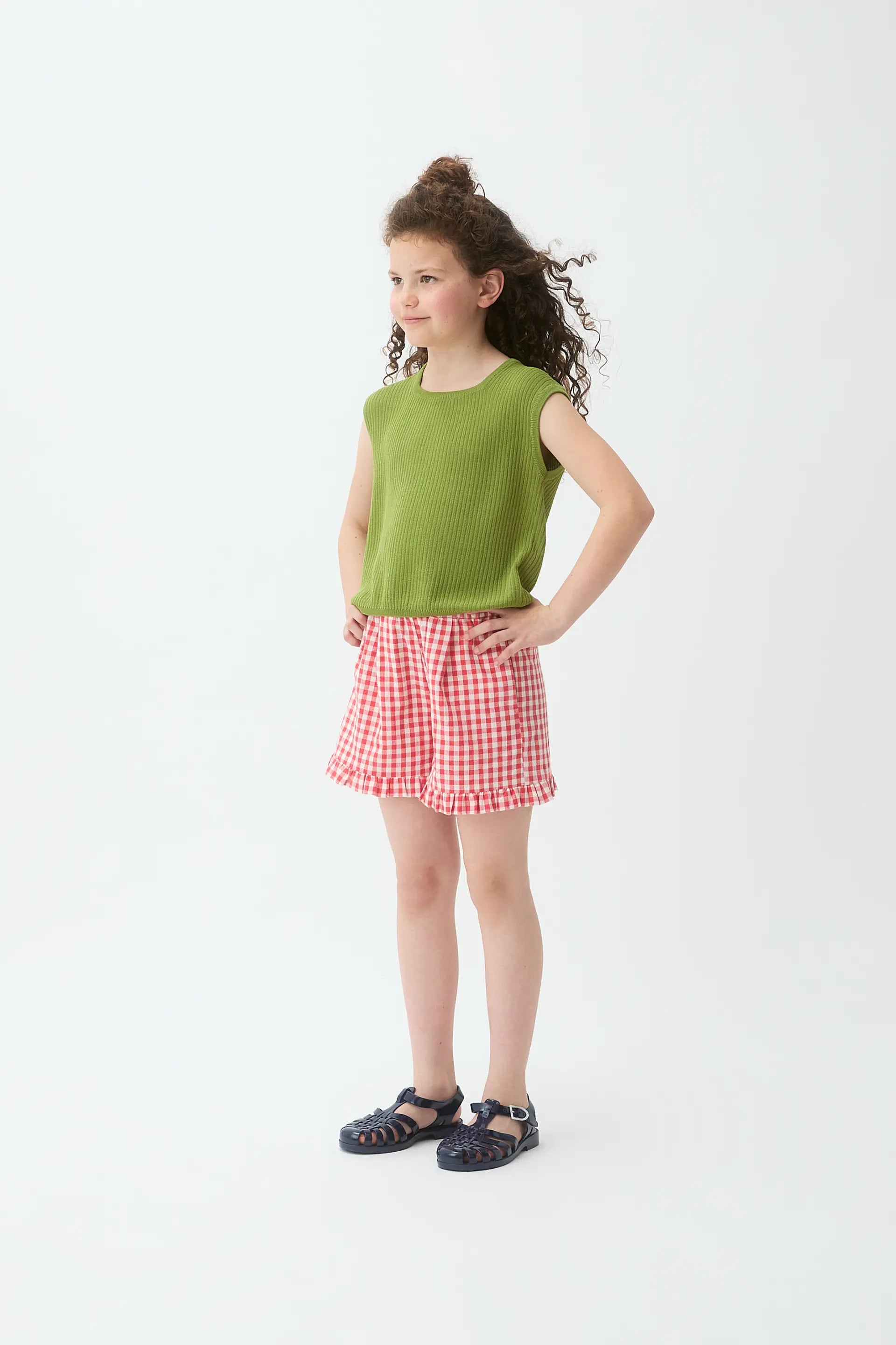 Girls' shorts made from 100% cotton with a red gingham print. High-waisted elastic waistband. The model is 134 cm tall and wears size 8-9 years.