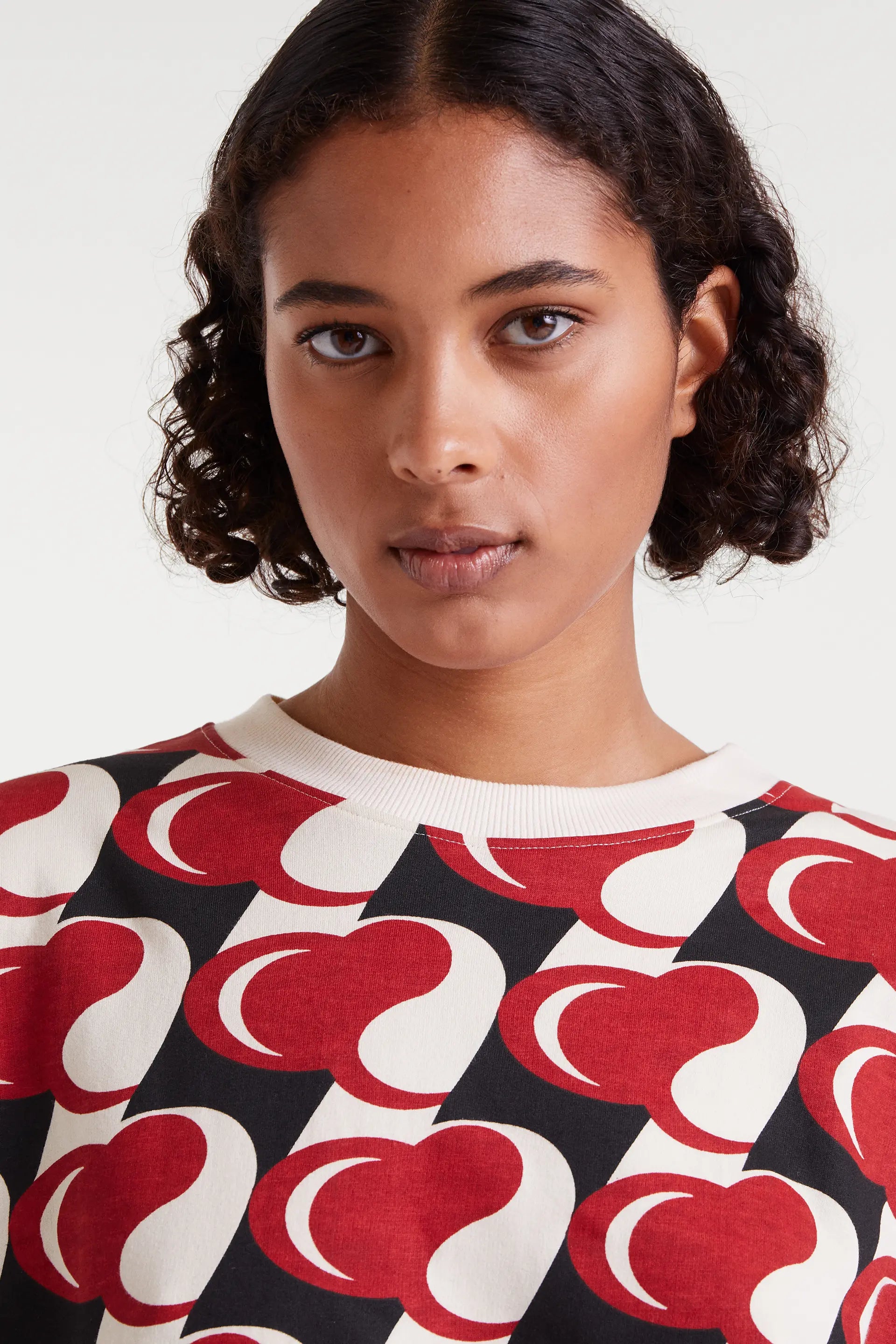 100% cotton sweatshirt with a Heart Attack print. Crew neck and long sleeves. Asymmetric hem with side slits. Ribbed details. The model is 175 cm tall and is wearing a size S.