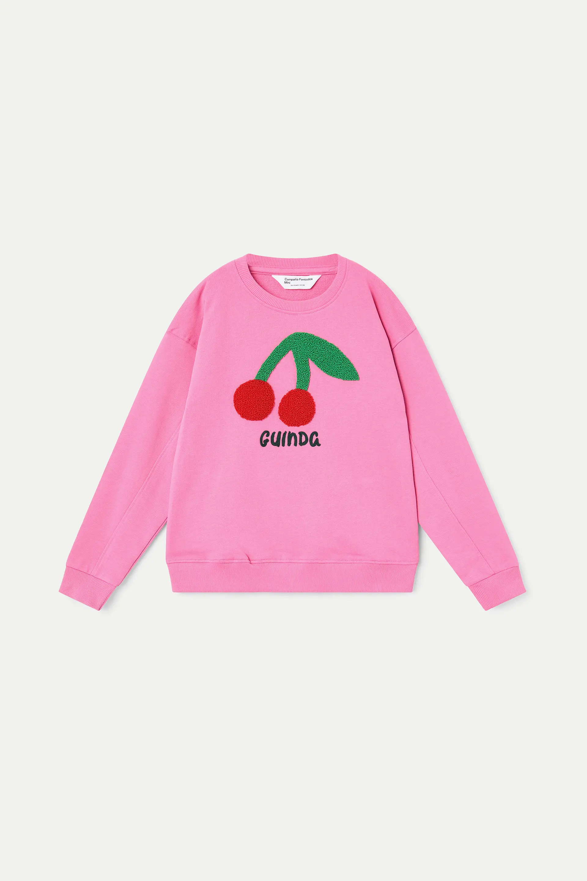 Girls' pink sweatshirt made from 100% cotton with a cherry patch. Features a round neck, long sleeves, and a slightly dropped shoulder. Ribbed trim details. The model is 135 cm tall and wears size 8-9 years.