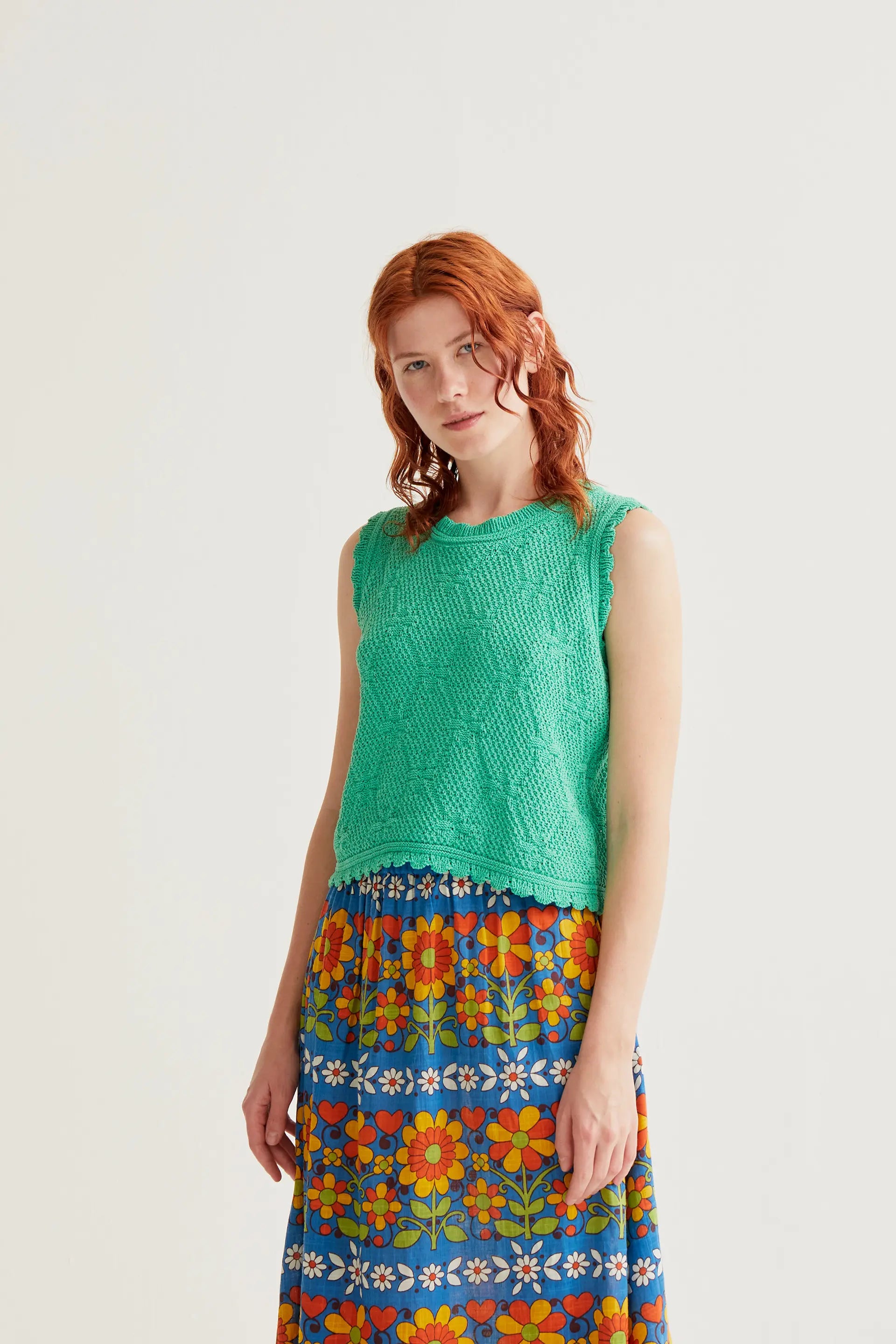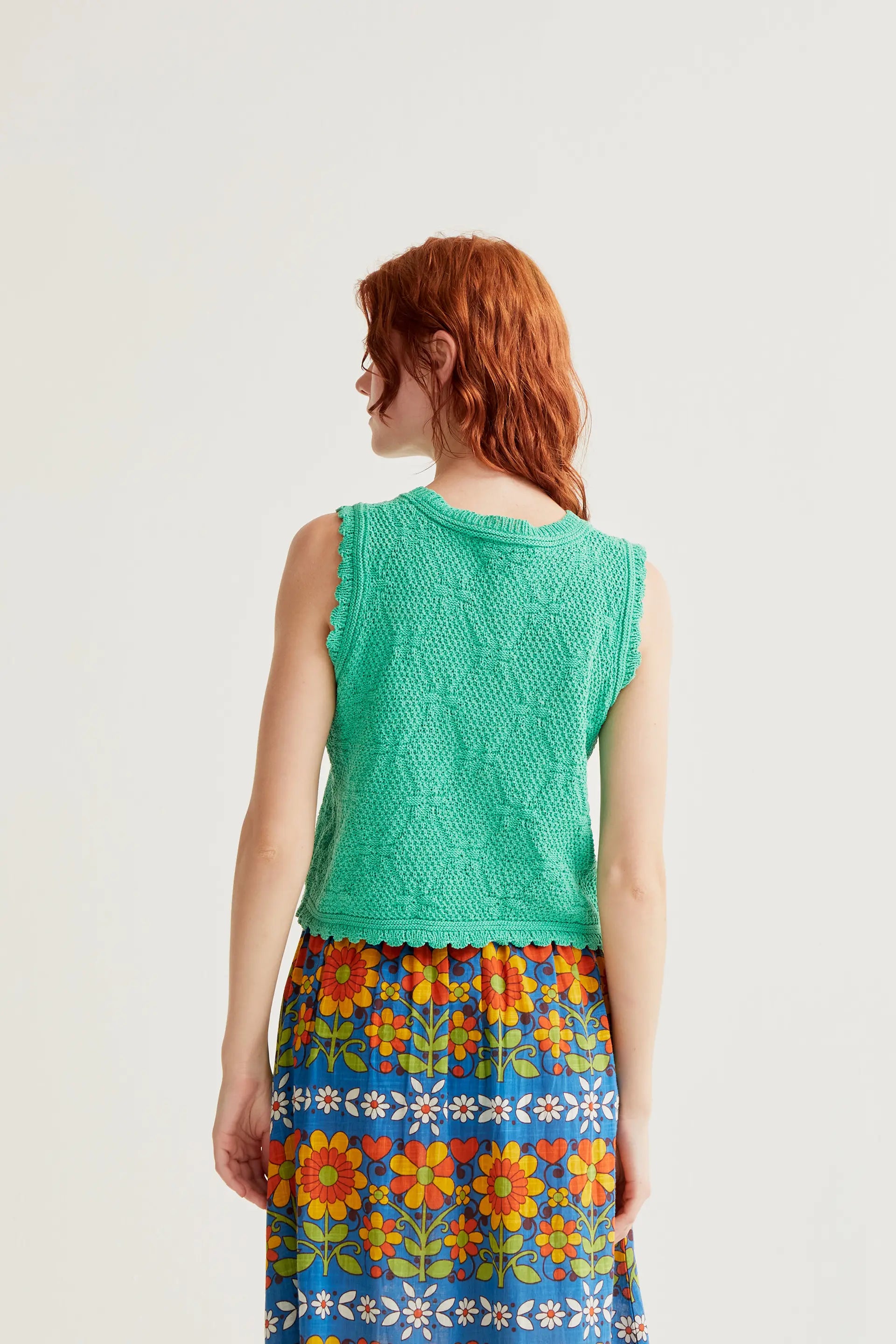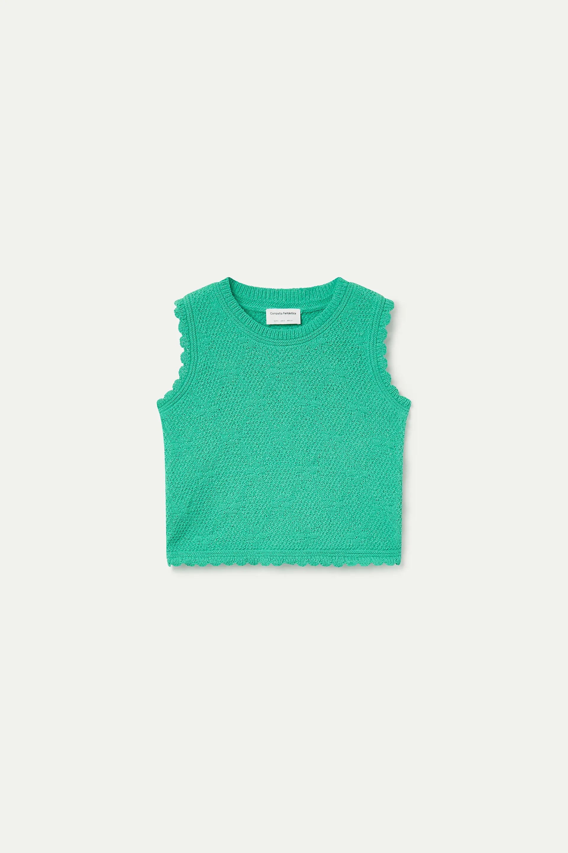 Green chain-stitched knit top. Round neck and sleeveless. Embroidered details. The model is 177 cm tall and wears size S.