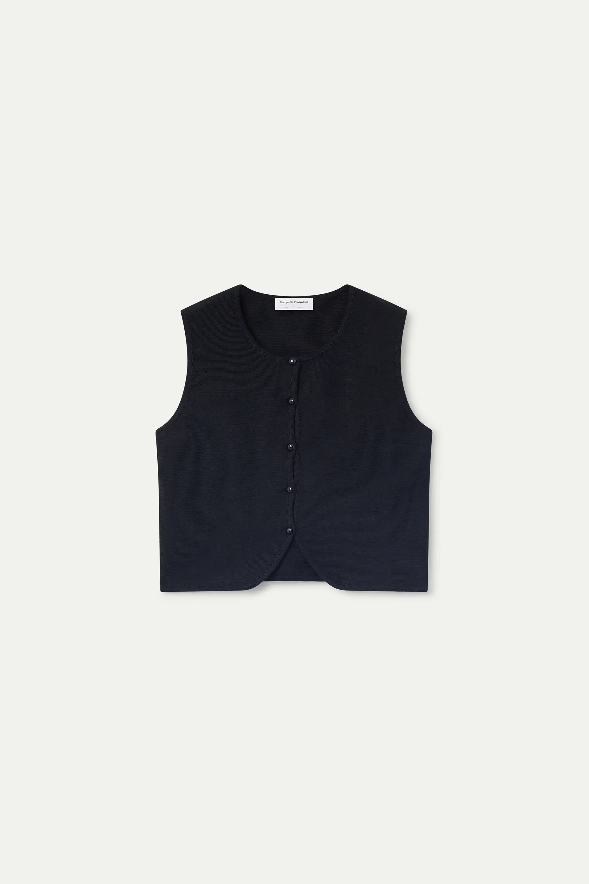 Black knit vest top. Round neck and sleeveless. Front closure with black round buttons. The model is 177 cm tall and wears size S.