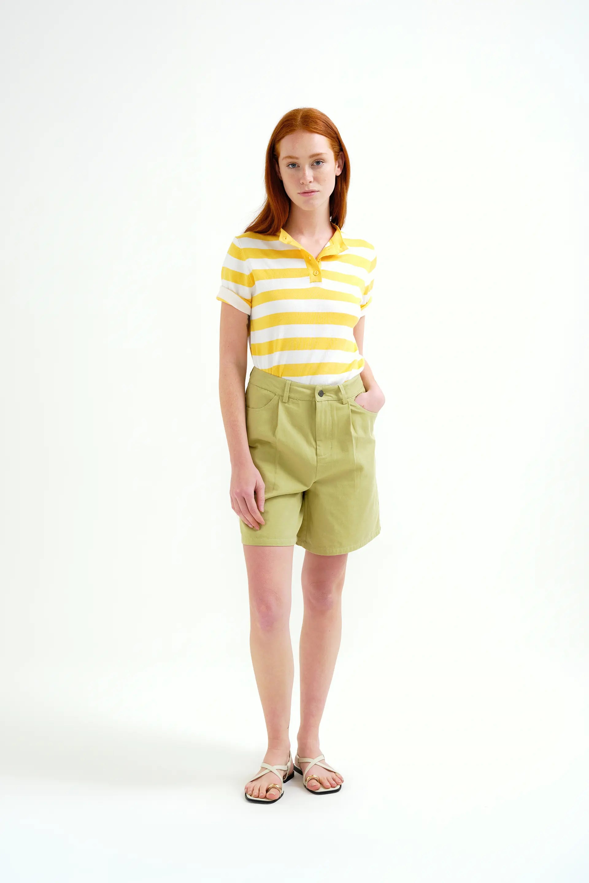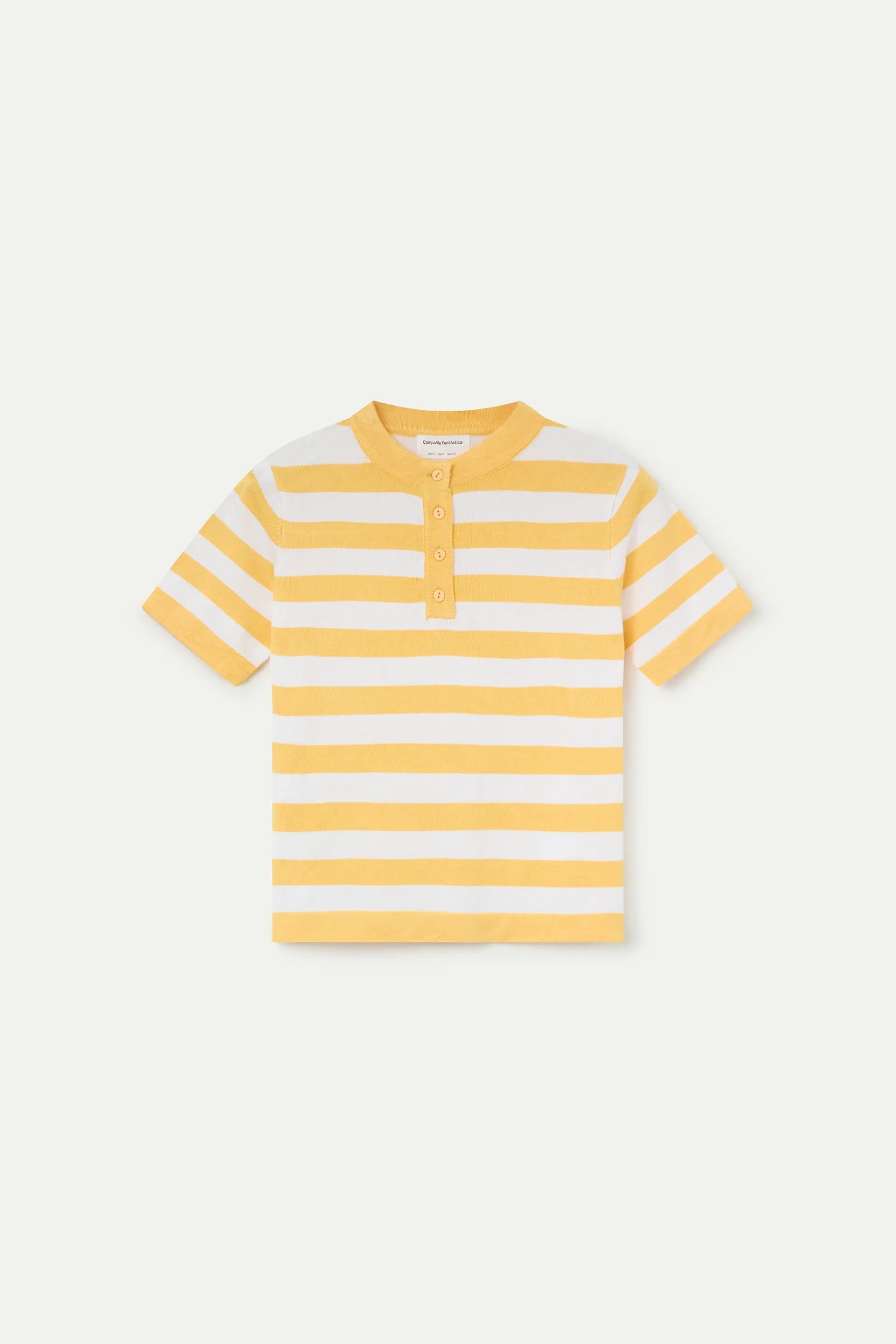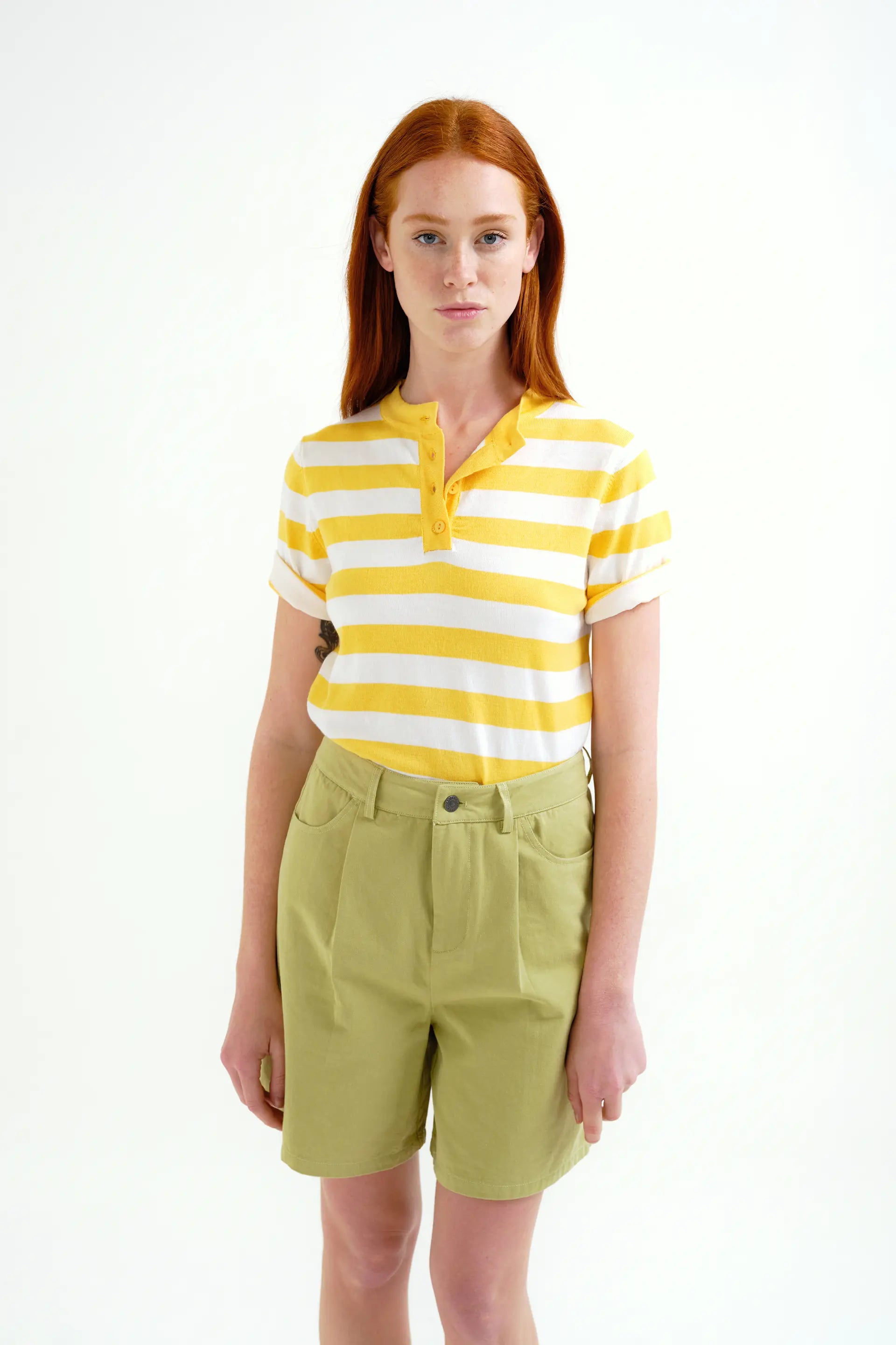 Top with a white and yellow striped print fabric. Round neck and short sleeves. Front button closure with yellow buttons. Ribbed trim details. The model is 175 cm tall and wears size S.