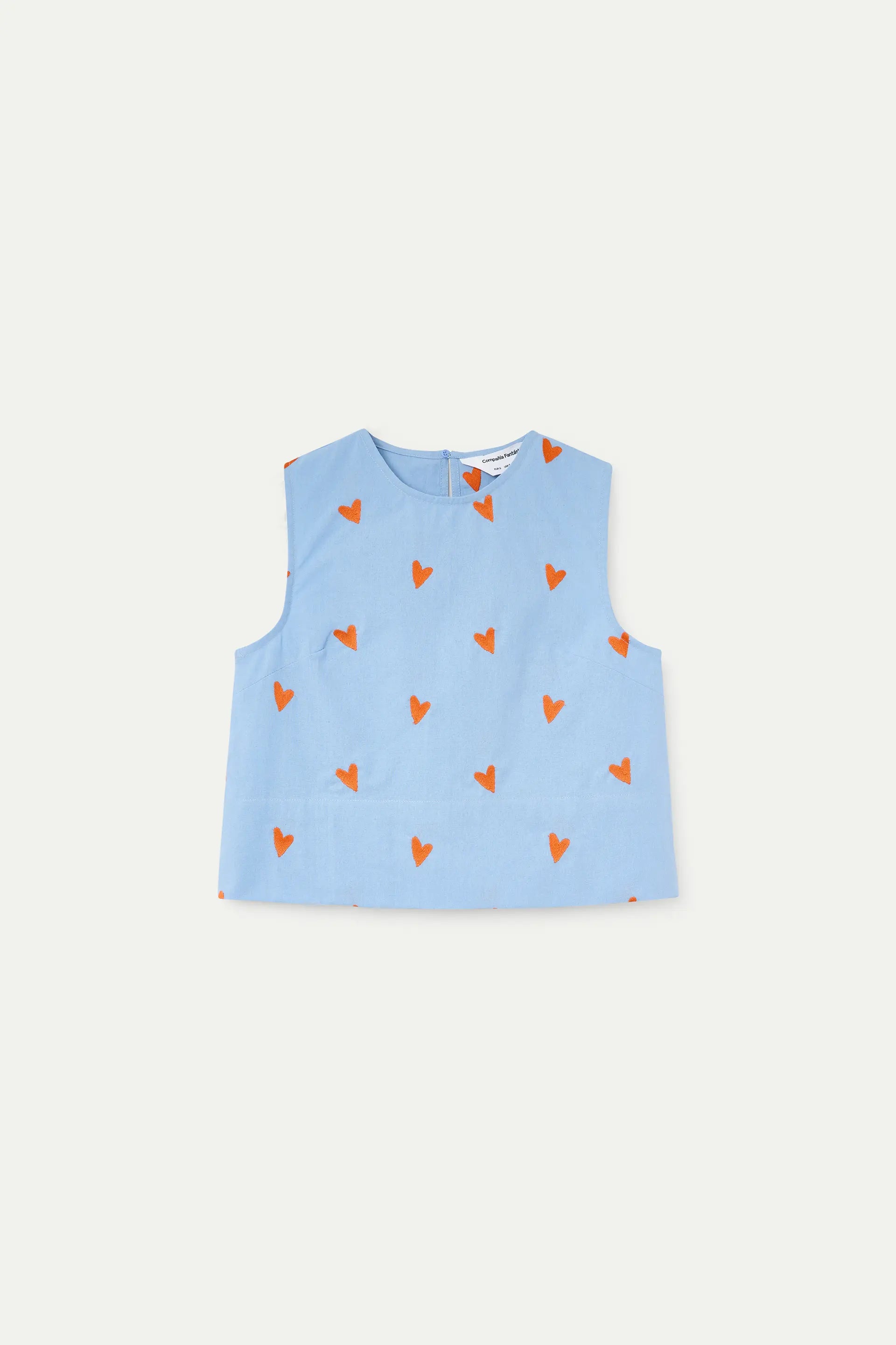 100% cotton top with a hearts print. Round neck and sleeveless. Concealed button closure at the back. The model is 175 cm tall and wears size S.