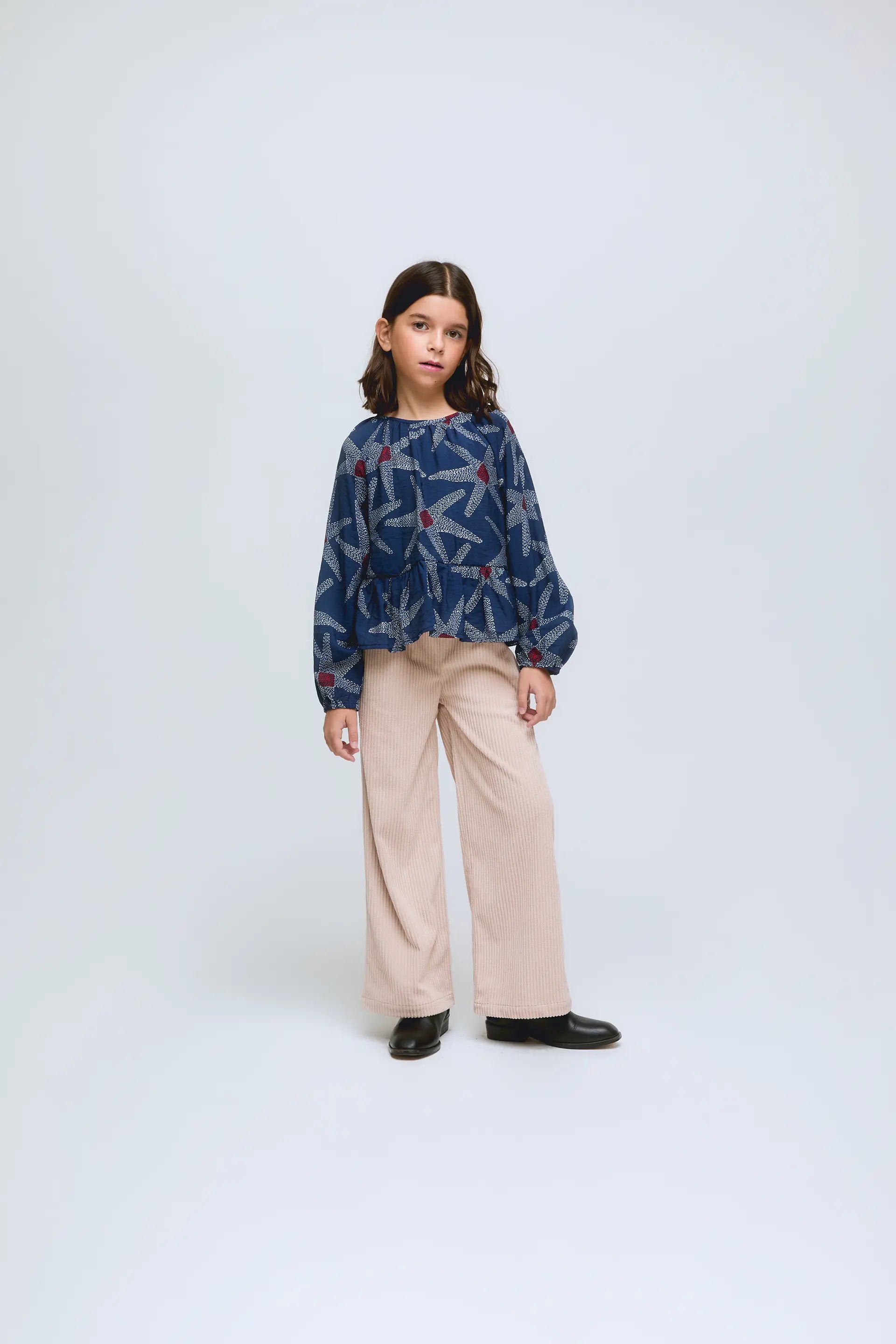 Girls' top with a navy blue Starship print and stars. Straight cut, long sleeves with gathered cuffs.