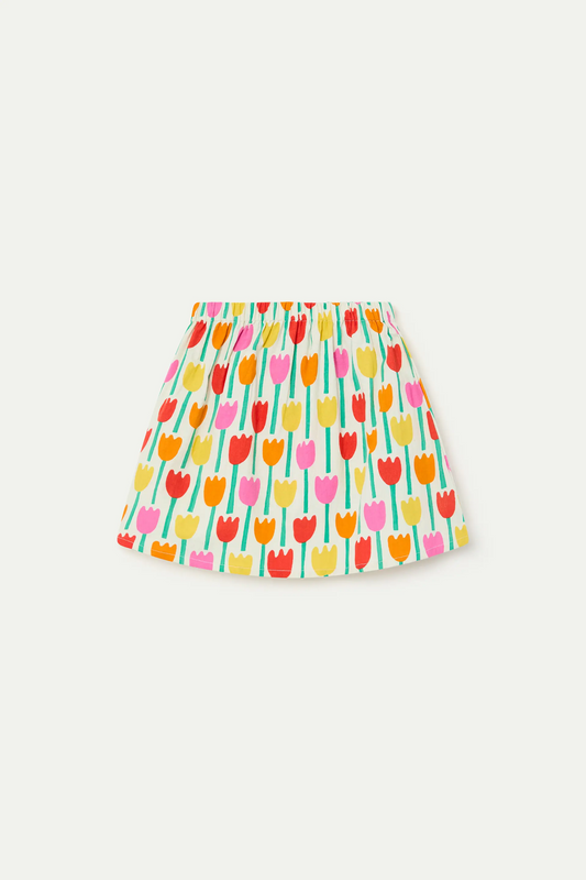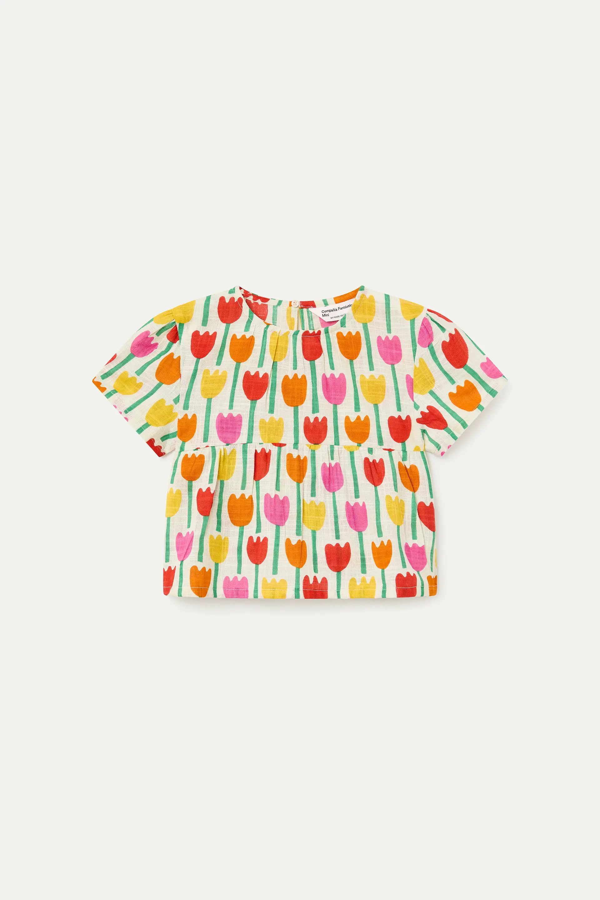 Girls' top made from 100% cotton with a tulip print. Round neck and short, slightly puffed sleeves. The model is 126 cm tall and wears size 8-9 years.