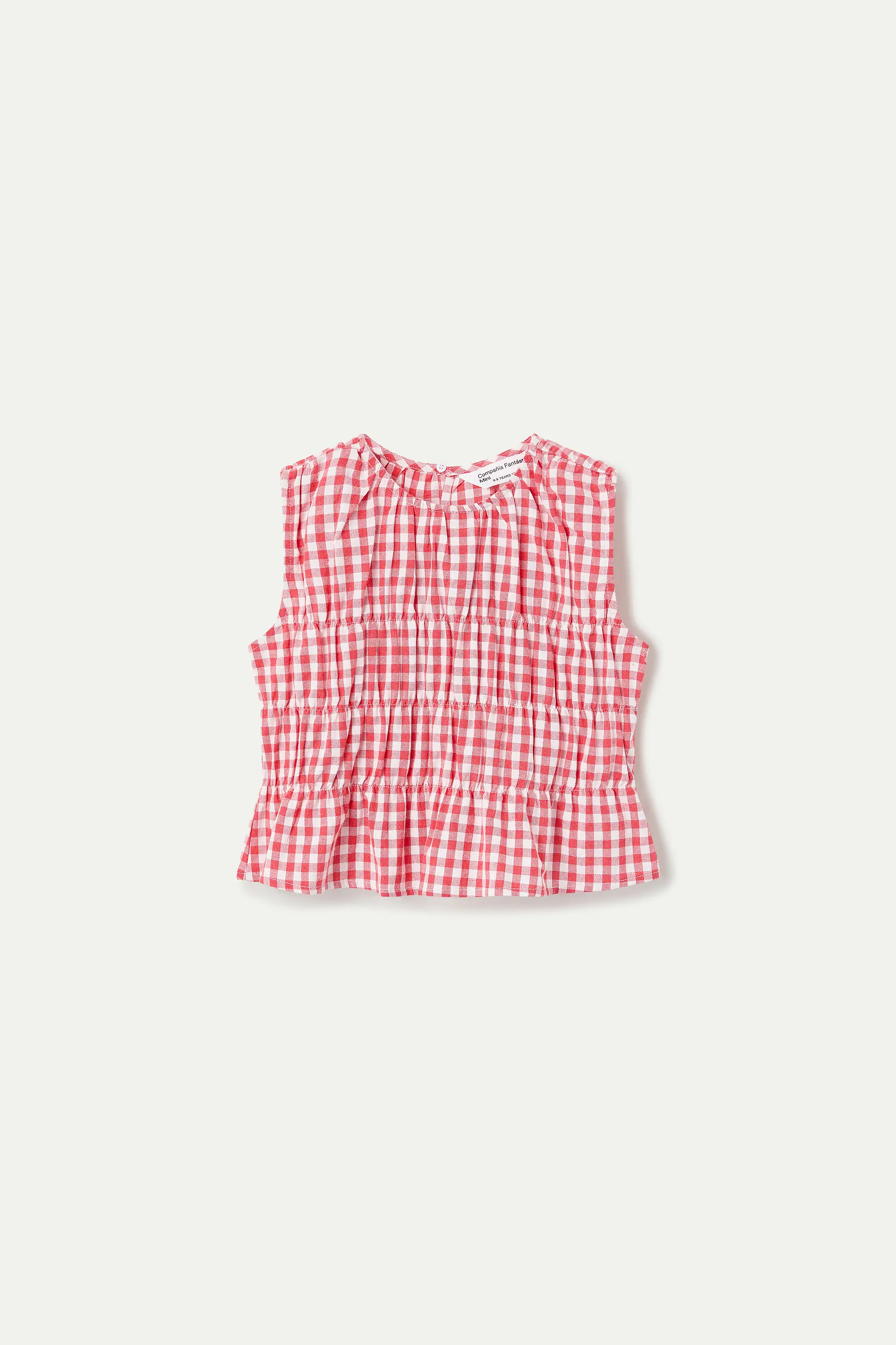 Girls' top made from 100% cotton with a red gingham print. Round neck and sleeveless. Elasticated trim details. The model is 135 cm tall and wears size 8-9 years.