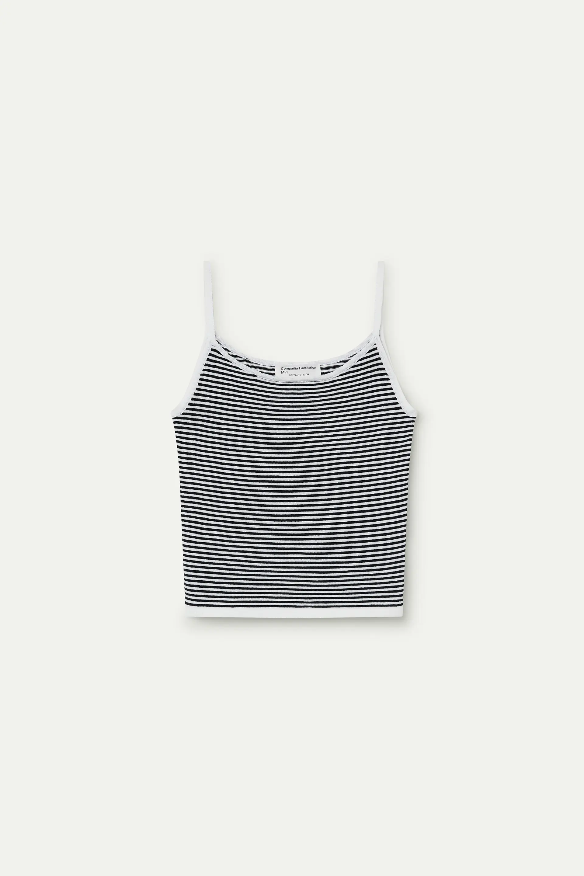 Girls' top with a black and white striped print fabric. Round neckline with thin straps. White trim details. The model is 135 cm tall and wears size 8-9 years.