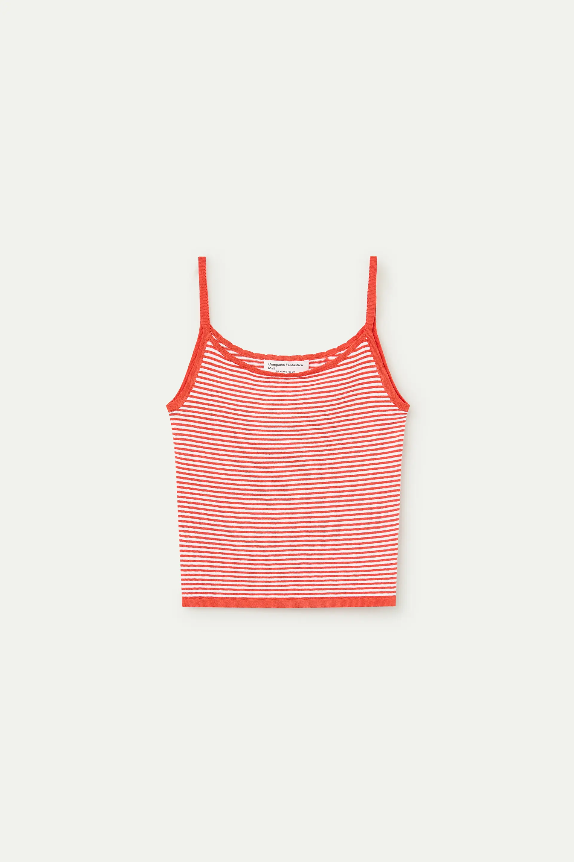 Girls' top in a white and red striped print fabric. Round neckline with thin straps. White trim details. The model is 135 cm tall and wears size 8-9 years.