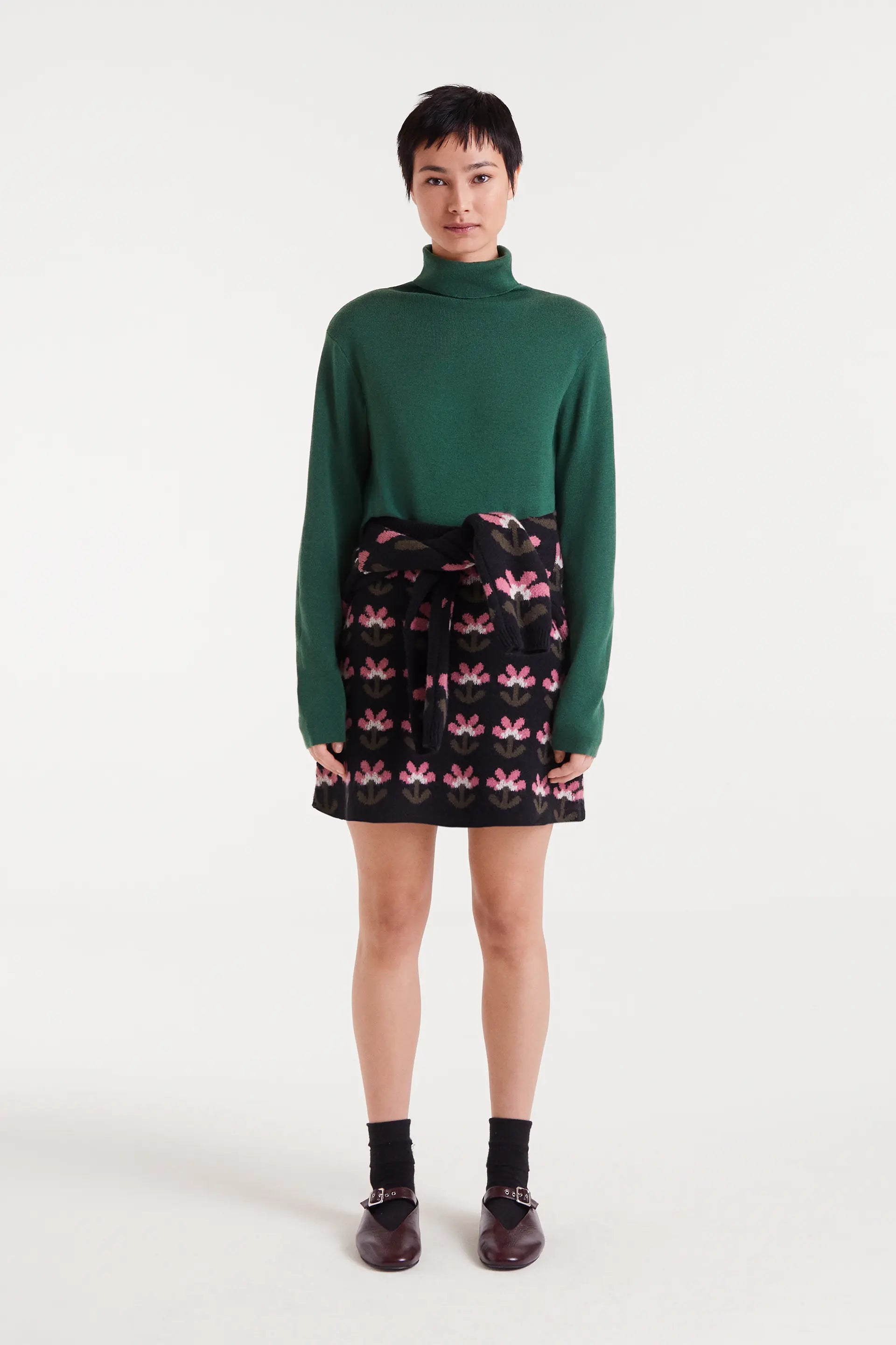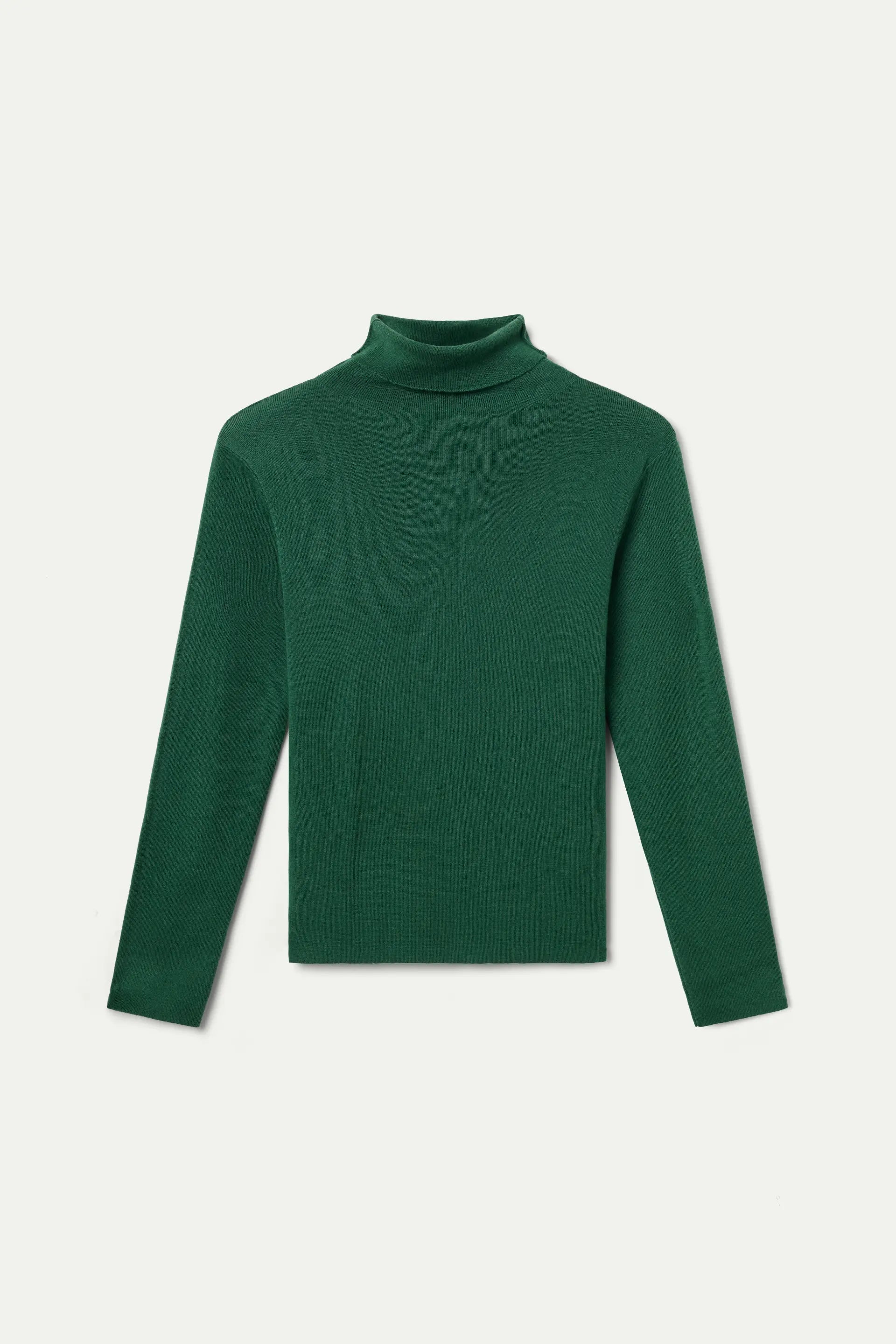 Green fine-knit top with a high neck and long sleeves. The model is 175 cm tall and is wearing a size S.
