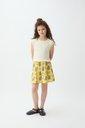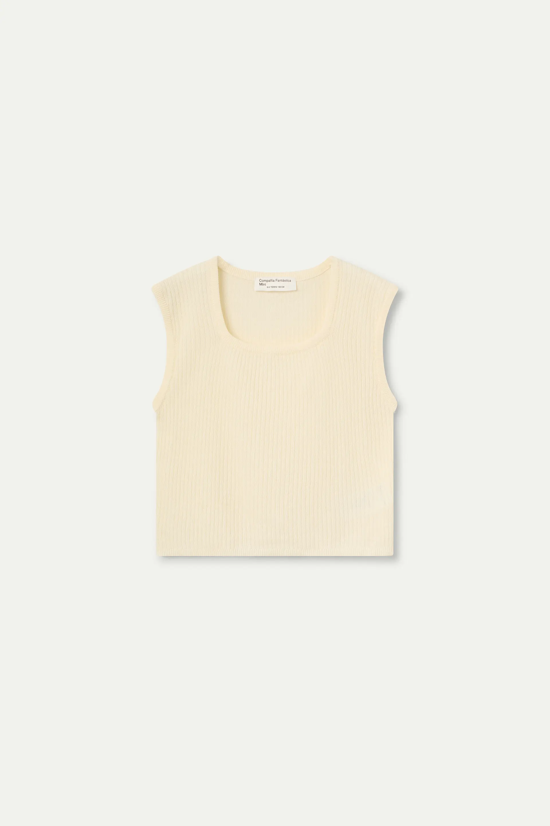 Girls' top in off-white knit fabric. Square neck and short sleeves. Ribbed trim details. The model is 134 cm tall and wears size 8-9 years.
