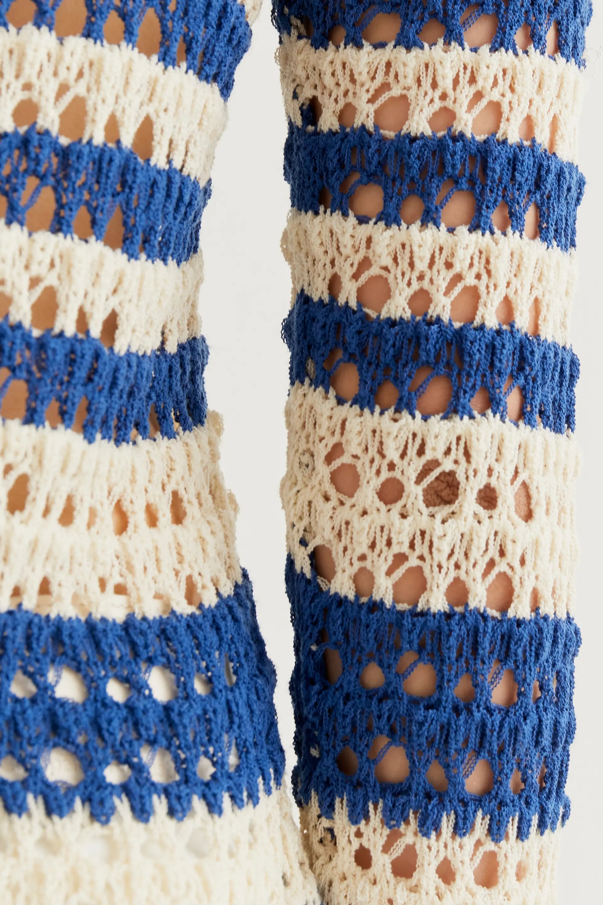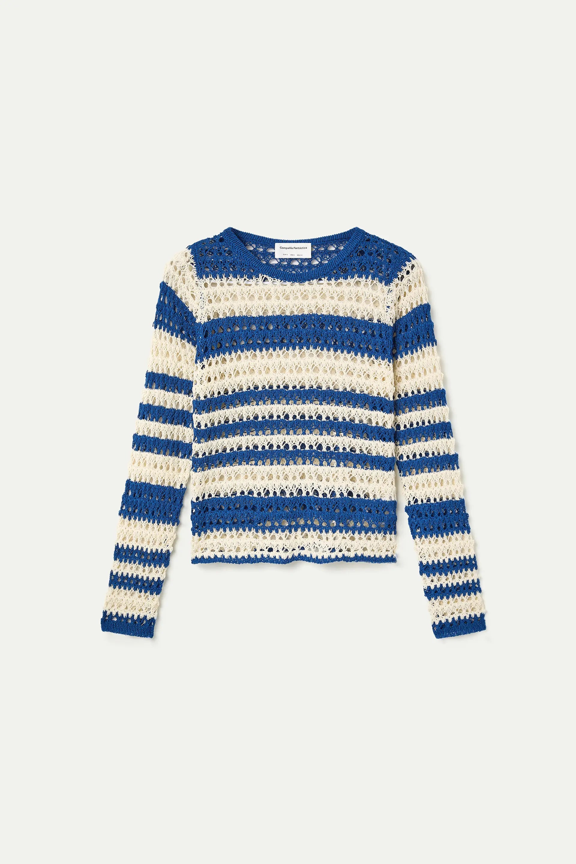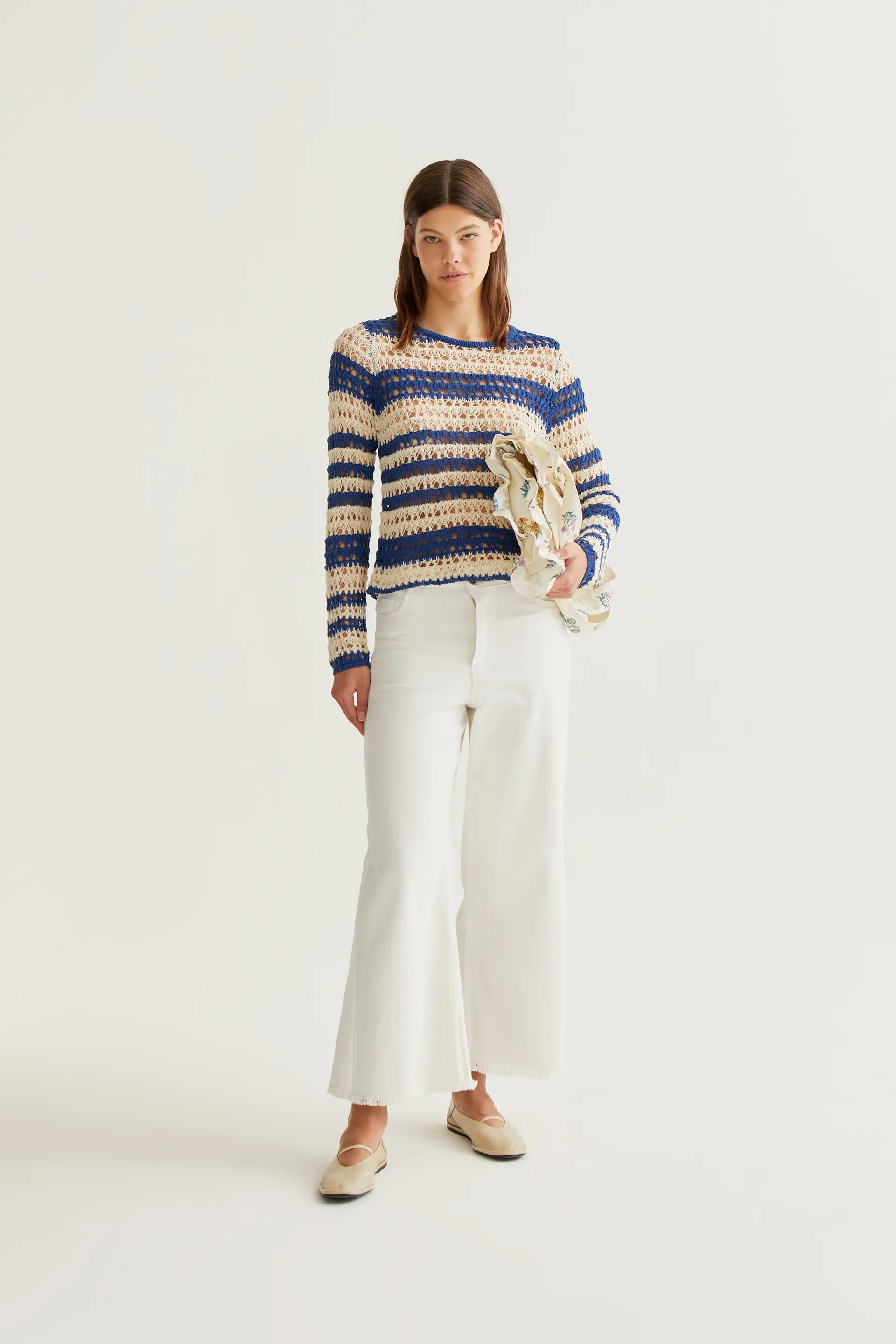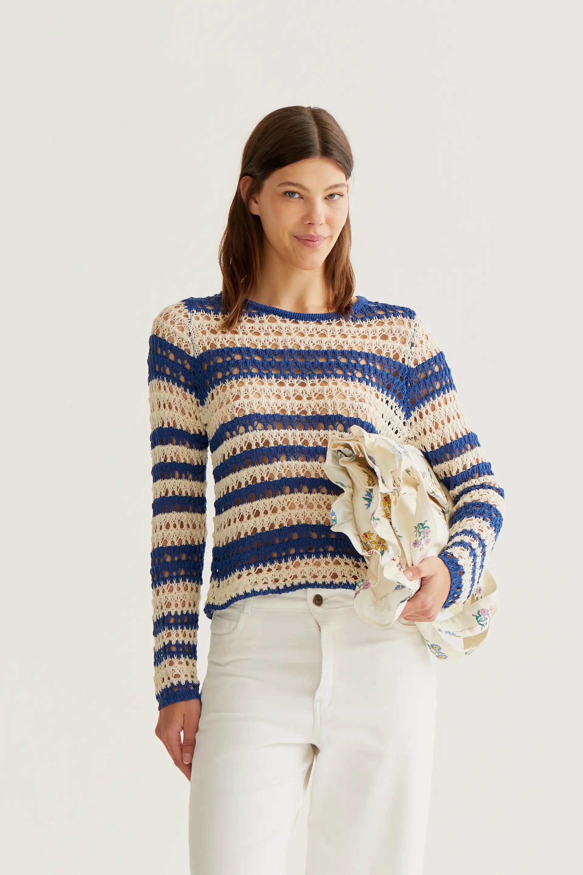 Openwork knit top with white and blue stripes. Round neck and long sleeves. Ribbed trim details. The model is 177 cm tall and wears size S.