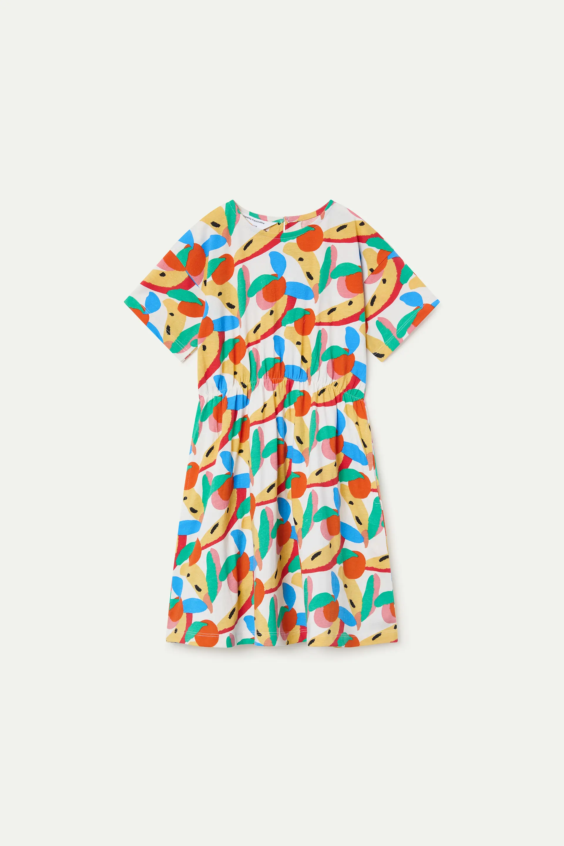 Girls' dress made from 100% cotton with a tutti frutti print. Round neck and short sleeves. Slightly dropped shoulders. Adjustable elastic waistband. The model is 135 cm tall and wears size 8-9 years.