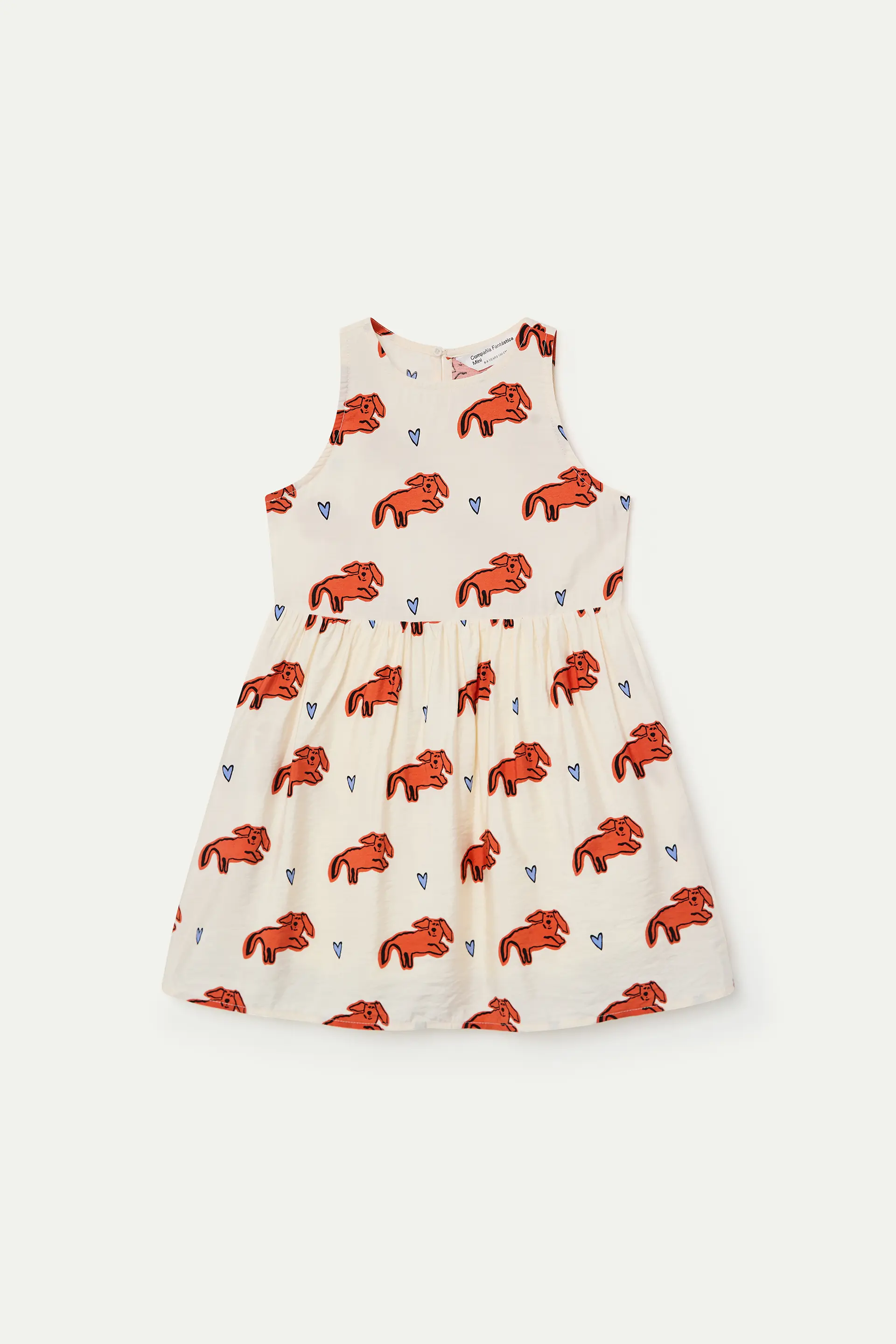 Short crepe dress for girls with a tochi print. Round neck and sleeveless. Elasticated waist. Lined. The model is 126 cm tall and wears size 8-9 years.
