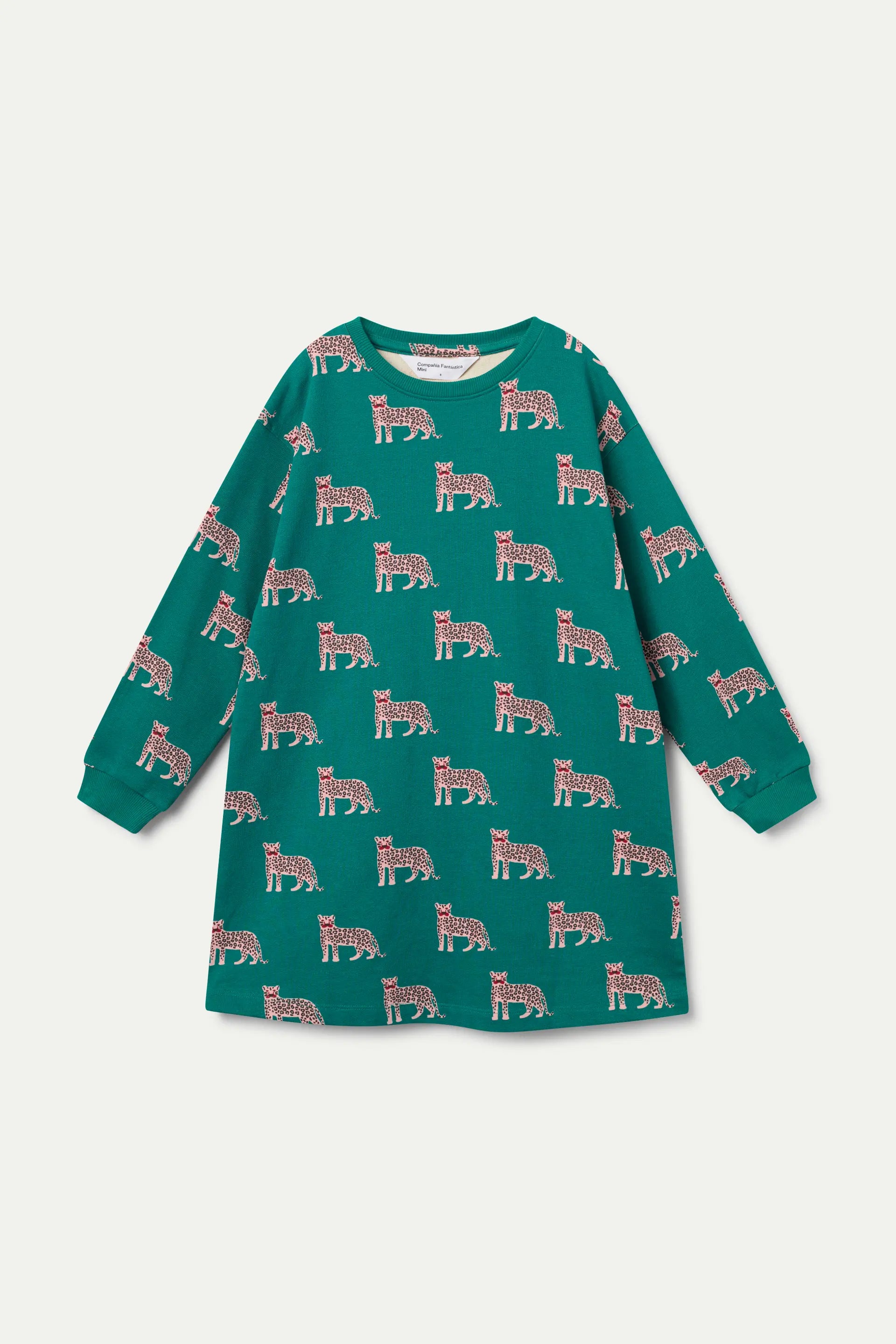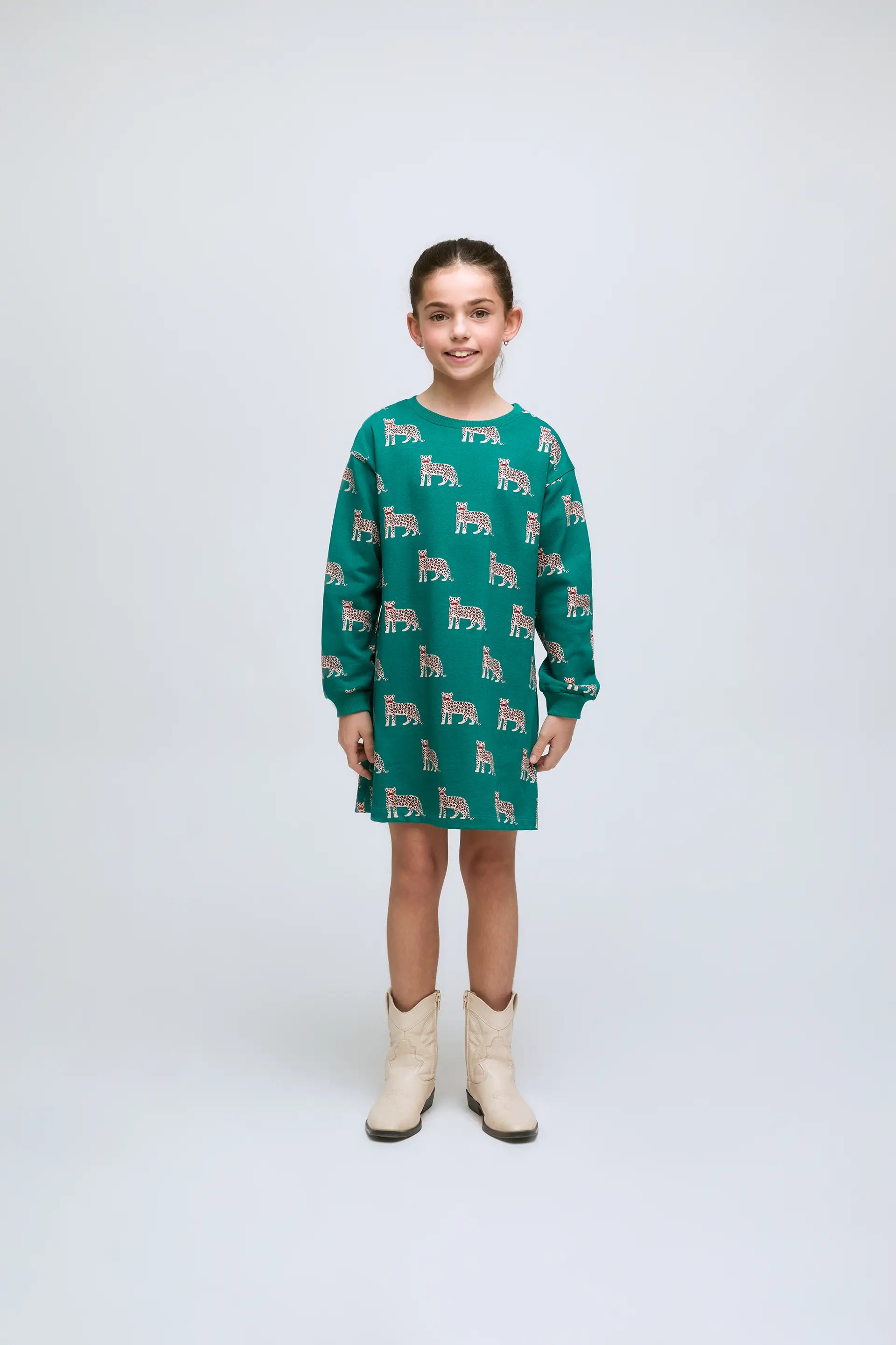 Short, long-sleeved dress made from 100% cotton. Featuring an Onca jaguar print, it features a round neckline and sweatshirt-style cuffs.