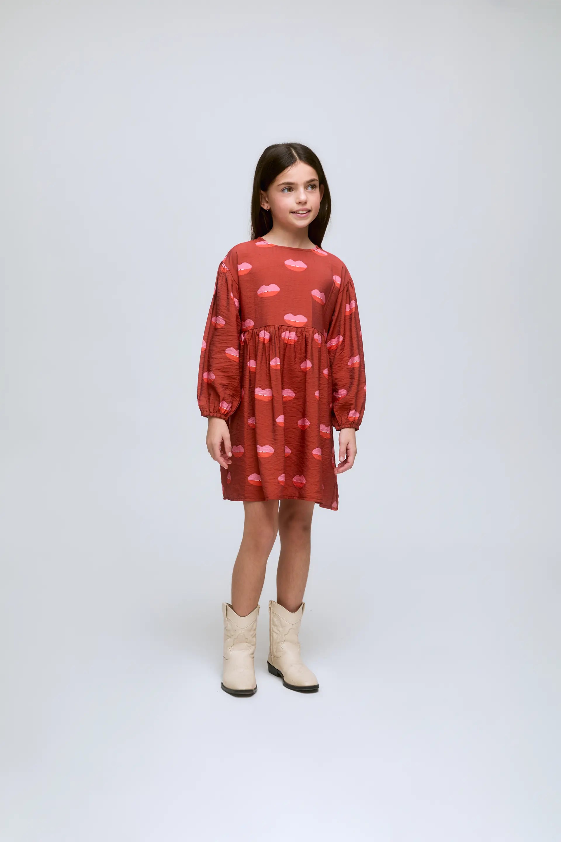 Girls' short dress in lightweight crepe with a Lips print. Featuring a round neckline and long puffed sleeves with elastic trim. A cutout at the waist with draped details.