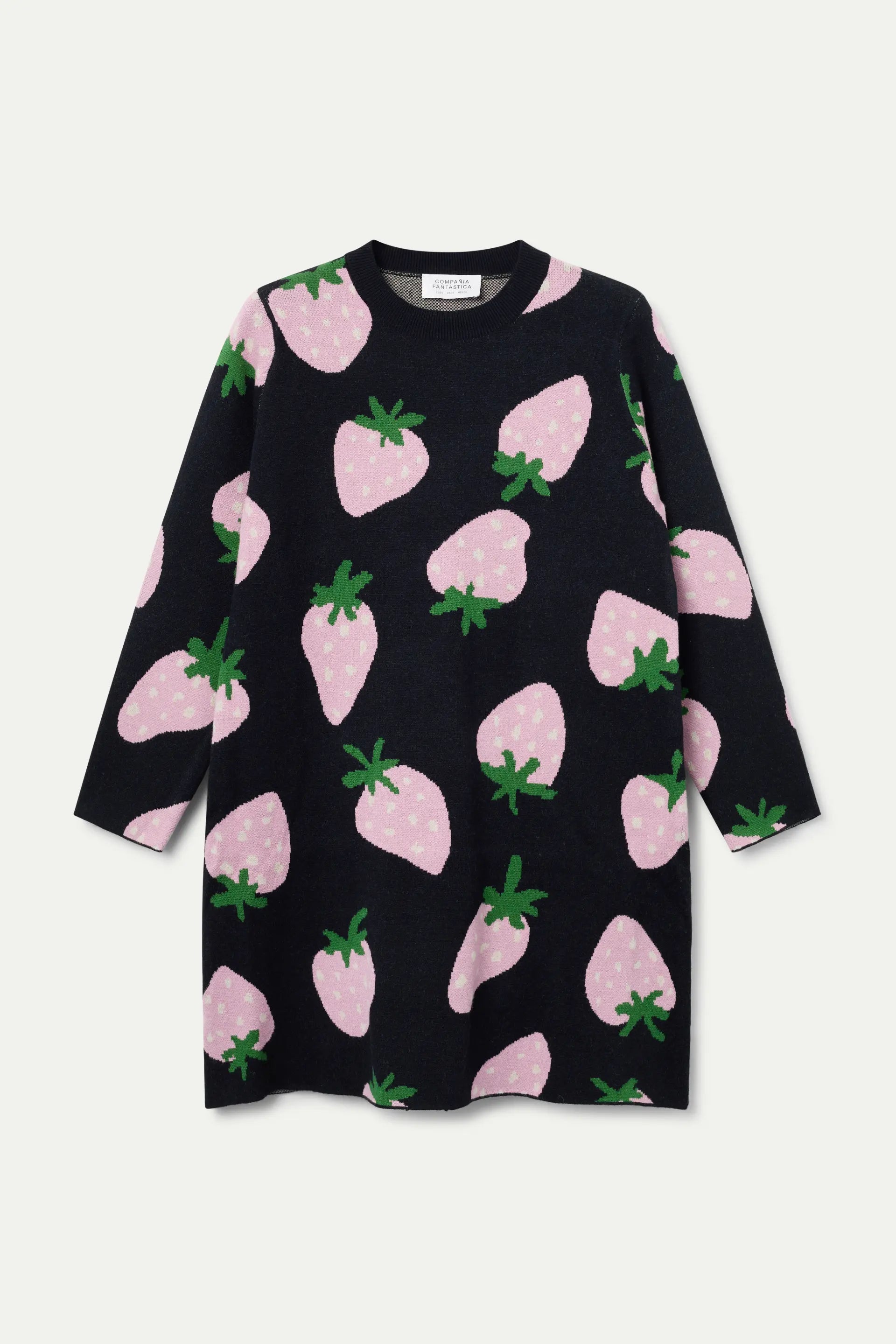 Short jacquard knit dress with a Morango print. Round neck and long sleeves. Ribbed trim. The model is 177 cm tall and is wearing a size S.