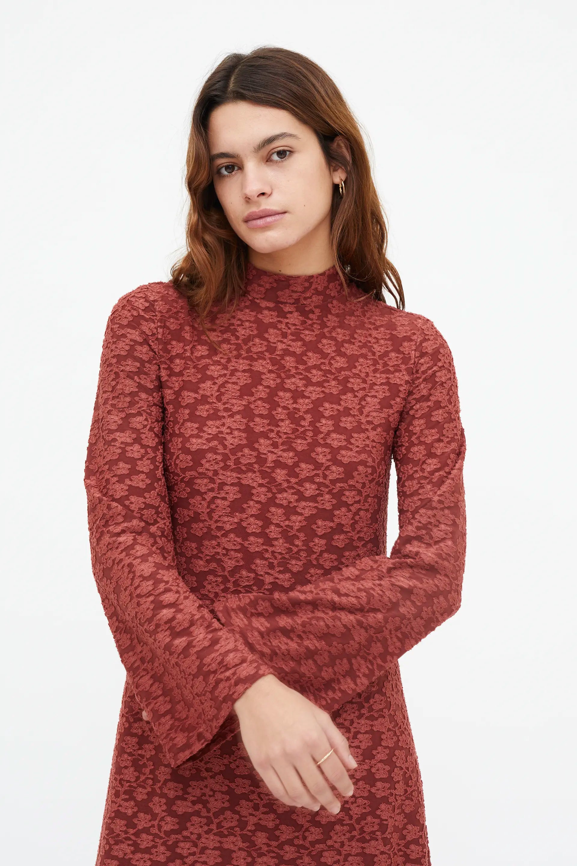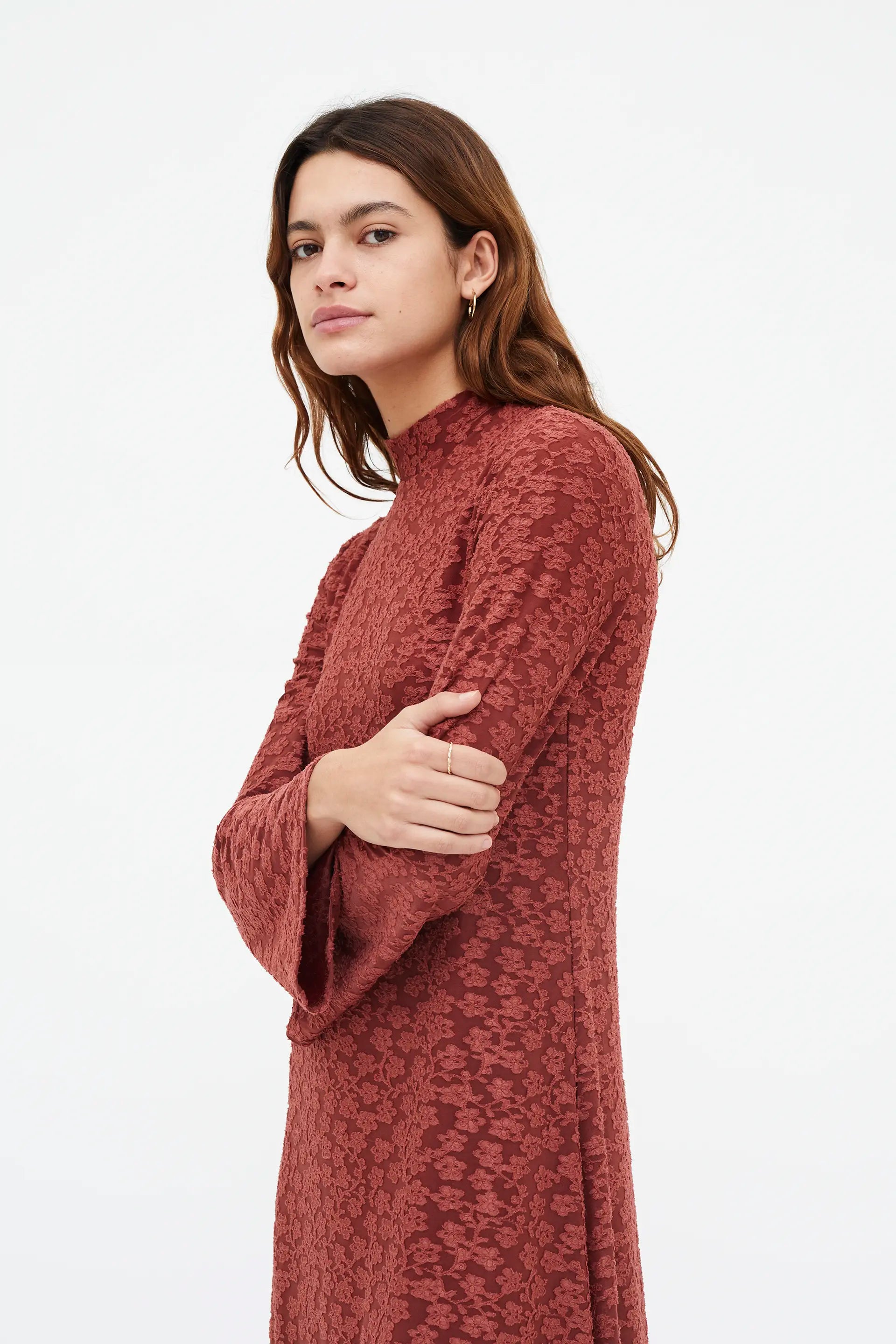 Long dress with brown knit and lace. Mock neck and long sleeves. Lined. The model is 177 cm tall and is wearing a size S.