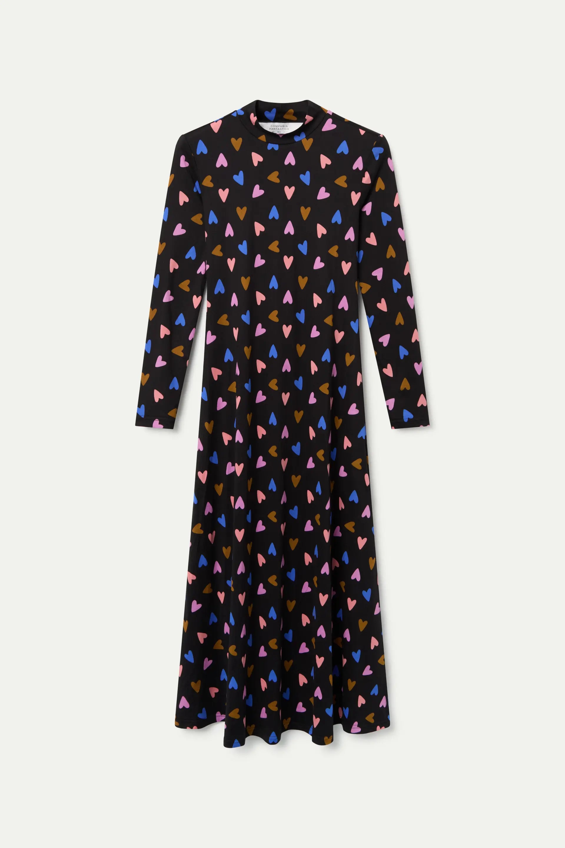 Long dress with Potpourri print knit fabric. Mock neck and long sleeves. Slight side slit. The model is 175 cm tall and is wearing a size S.