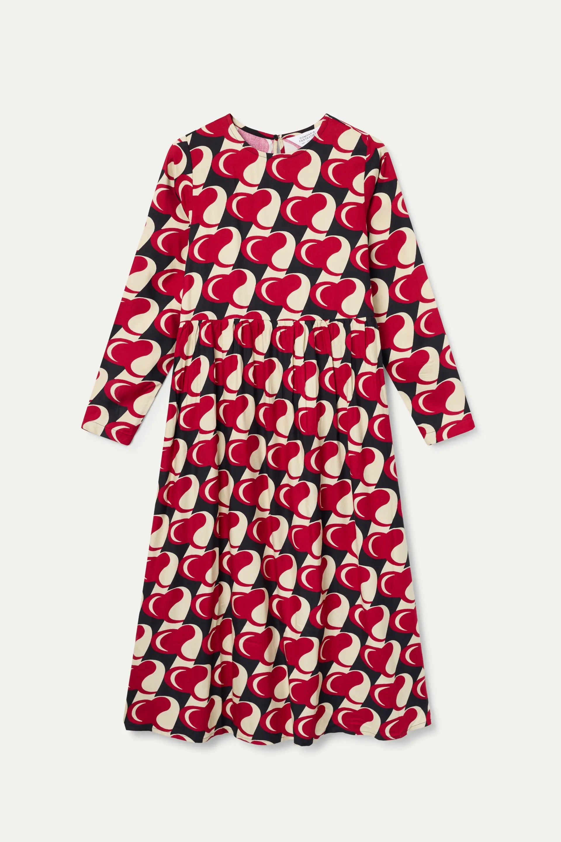 Viscose twill midi dress with a Heart Attack print. Round neck and long sleeves. Asymmetrical waist. Side pockets. The model is 178 cm tall and is wearing a size S.