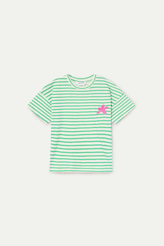 T-shirt con stampa a righe verdi e ricamo di tulipani