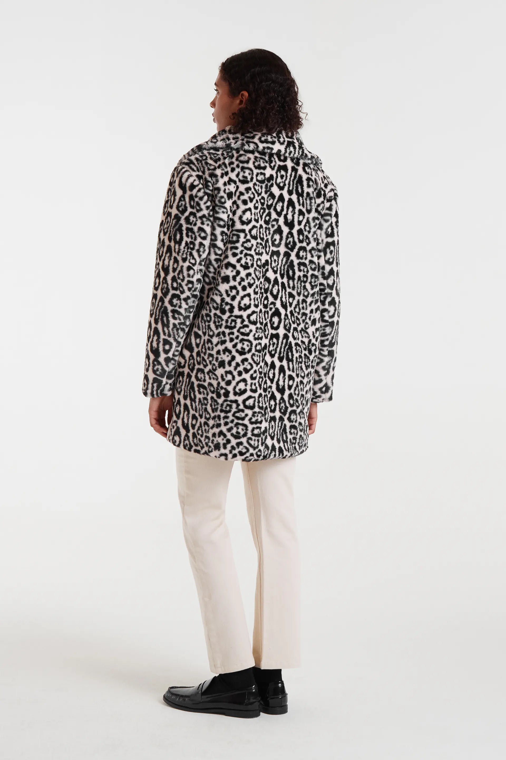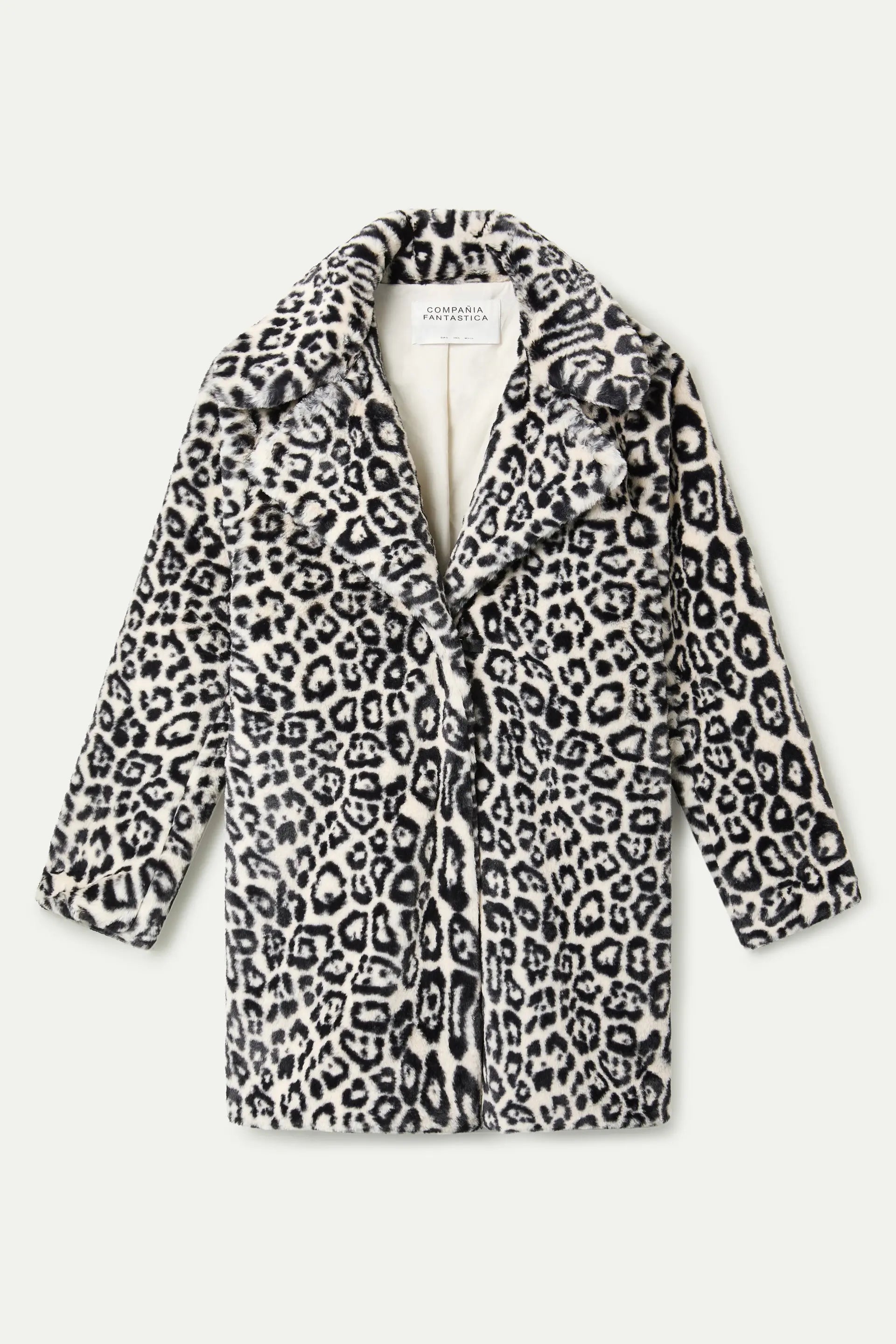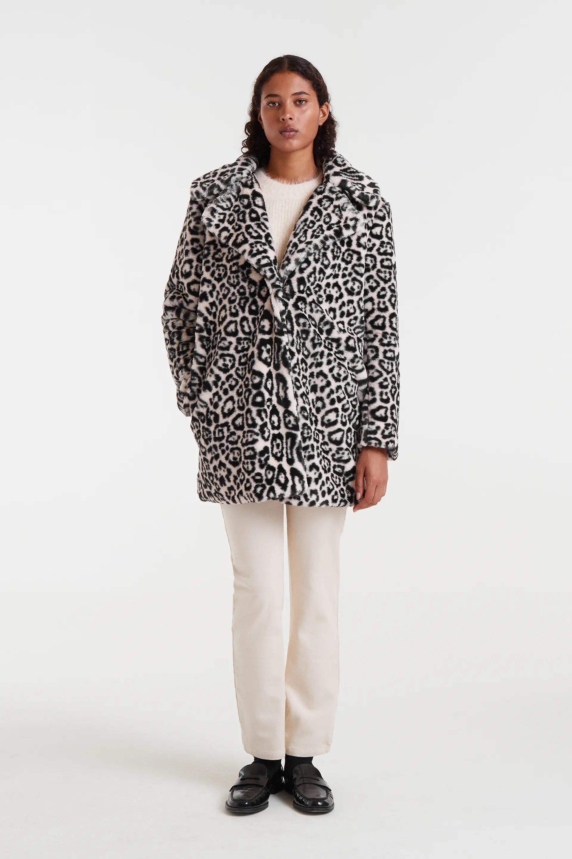 Cappotto in pelliccia sintetica bianca con stampa animalier. Collo a revers e maniche lunghe. Chiusura frontale con bottoni nascosti. Tasche laterali. La modella è alta 175 cm e indossa una taglia S.