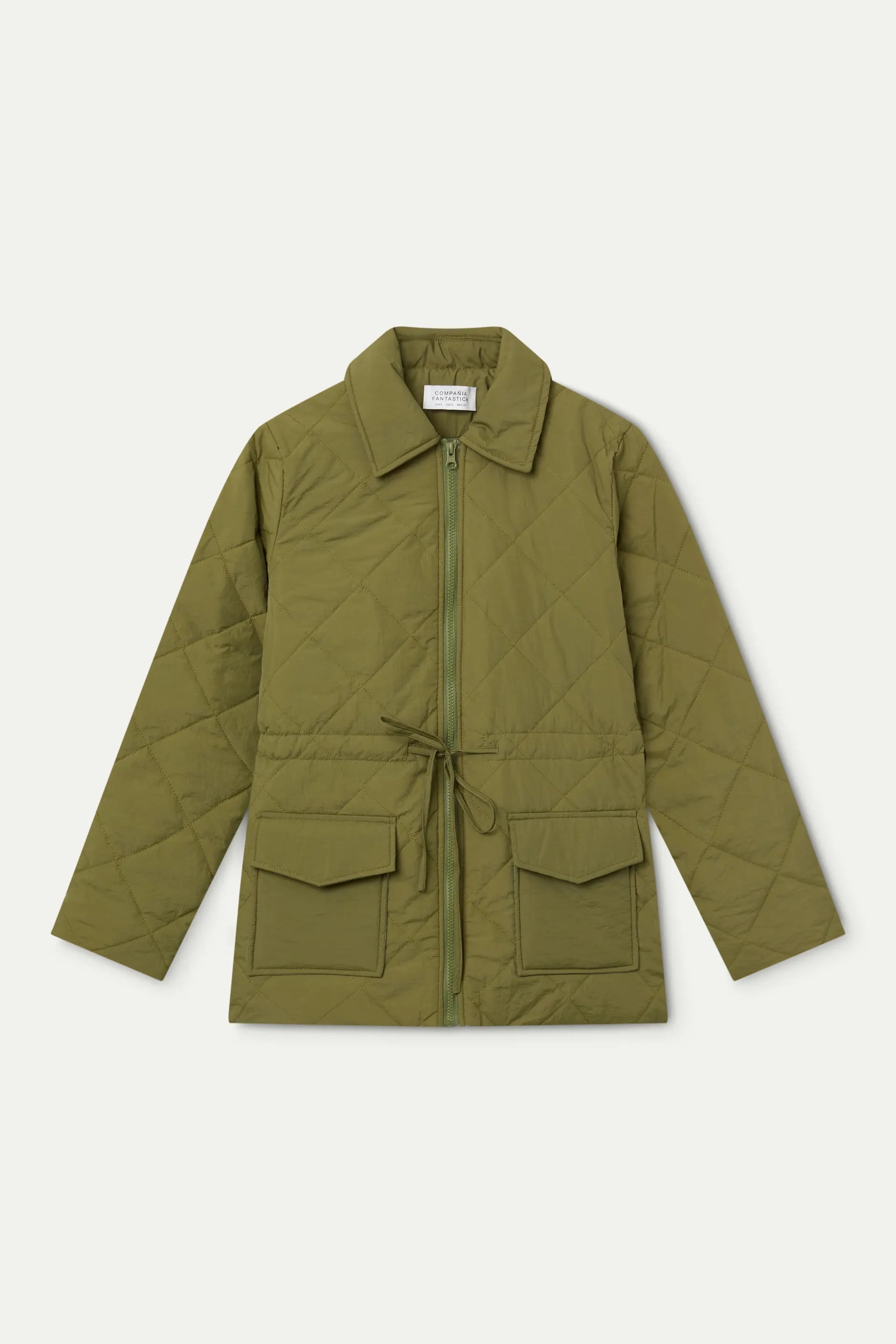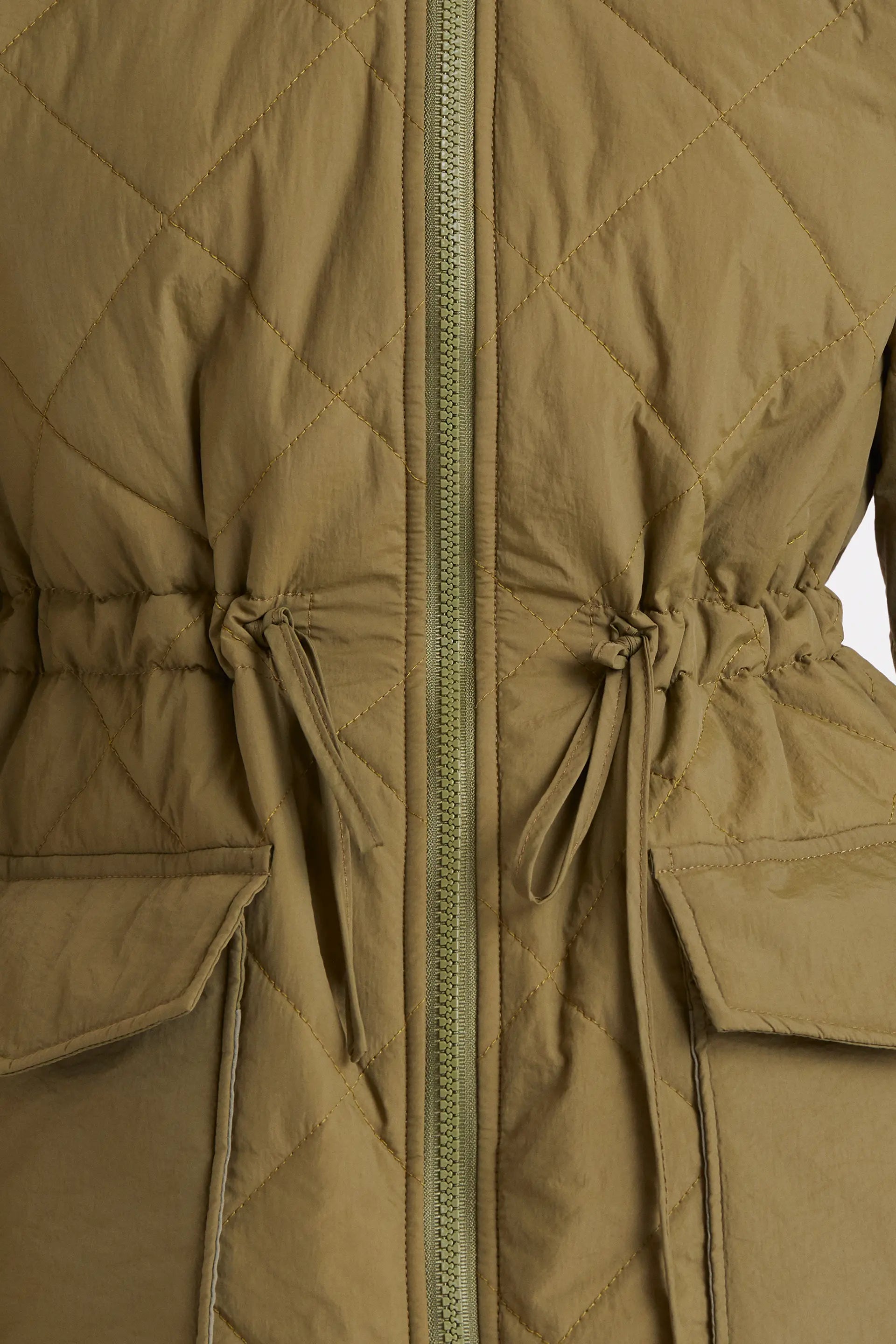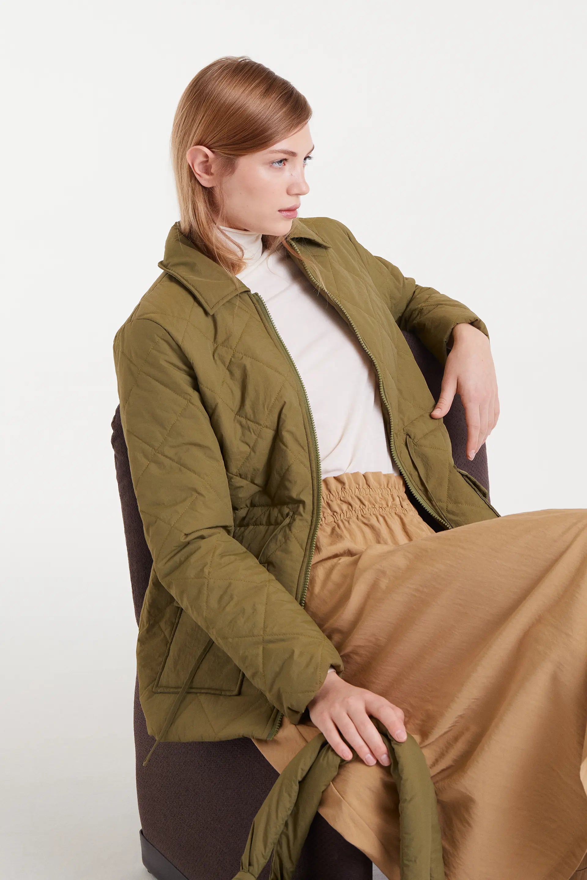 Cappotto corto in tessuto leggero trapuntato verde. Collo a revers e maniche lunghe. Cintura in vita. Chiusura frontale con zip. Tasche anteriori con patta. La modella è alta 179 cm e indossa una taglia S.