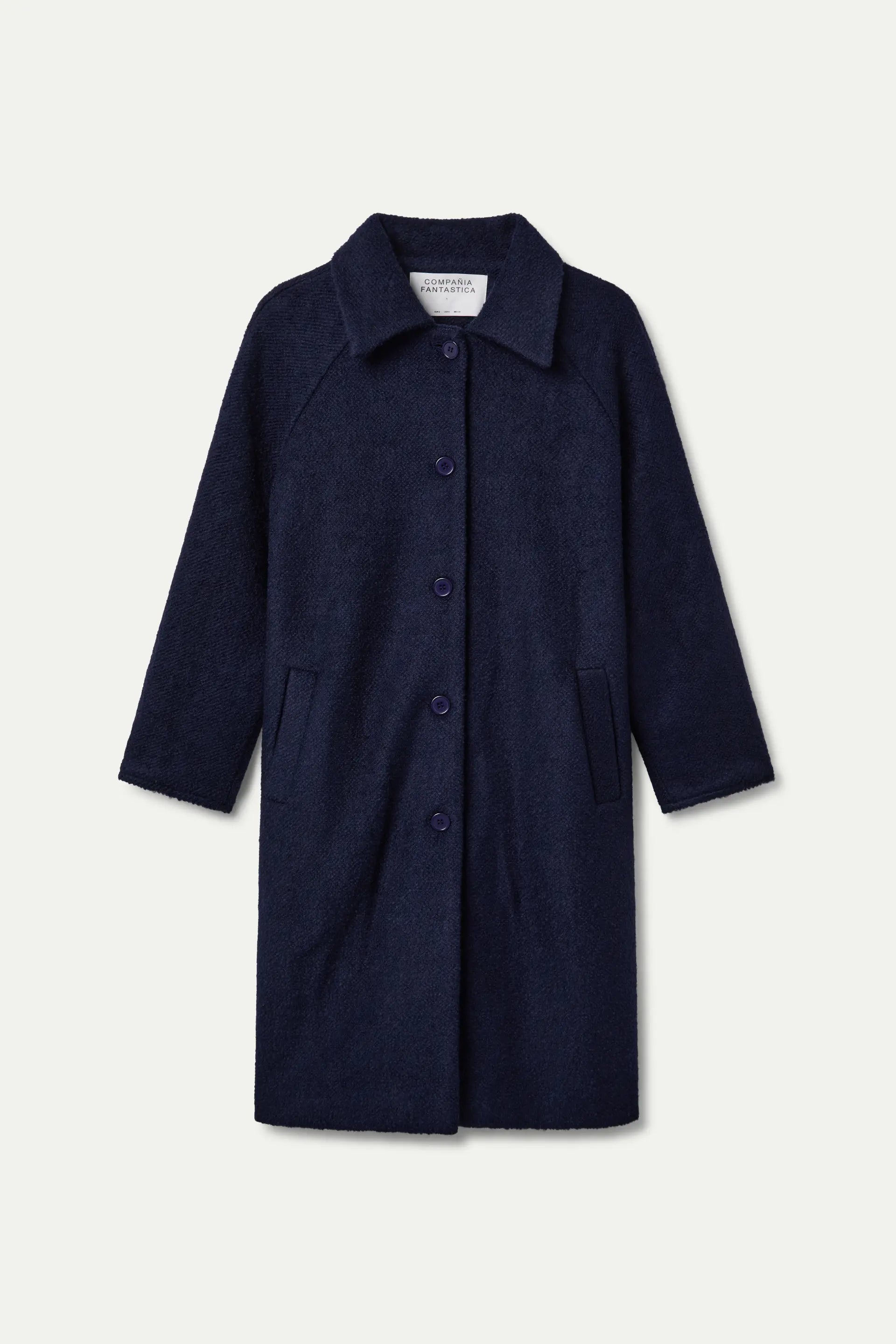Cappotto lungo blu navy. Collo a revers, maniche lunghe e tasche. Chiusura frontale con bottoni. Tasche anteriori. Foderato. La modella è alta 175 cm e indossa una taglia S.