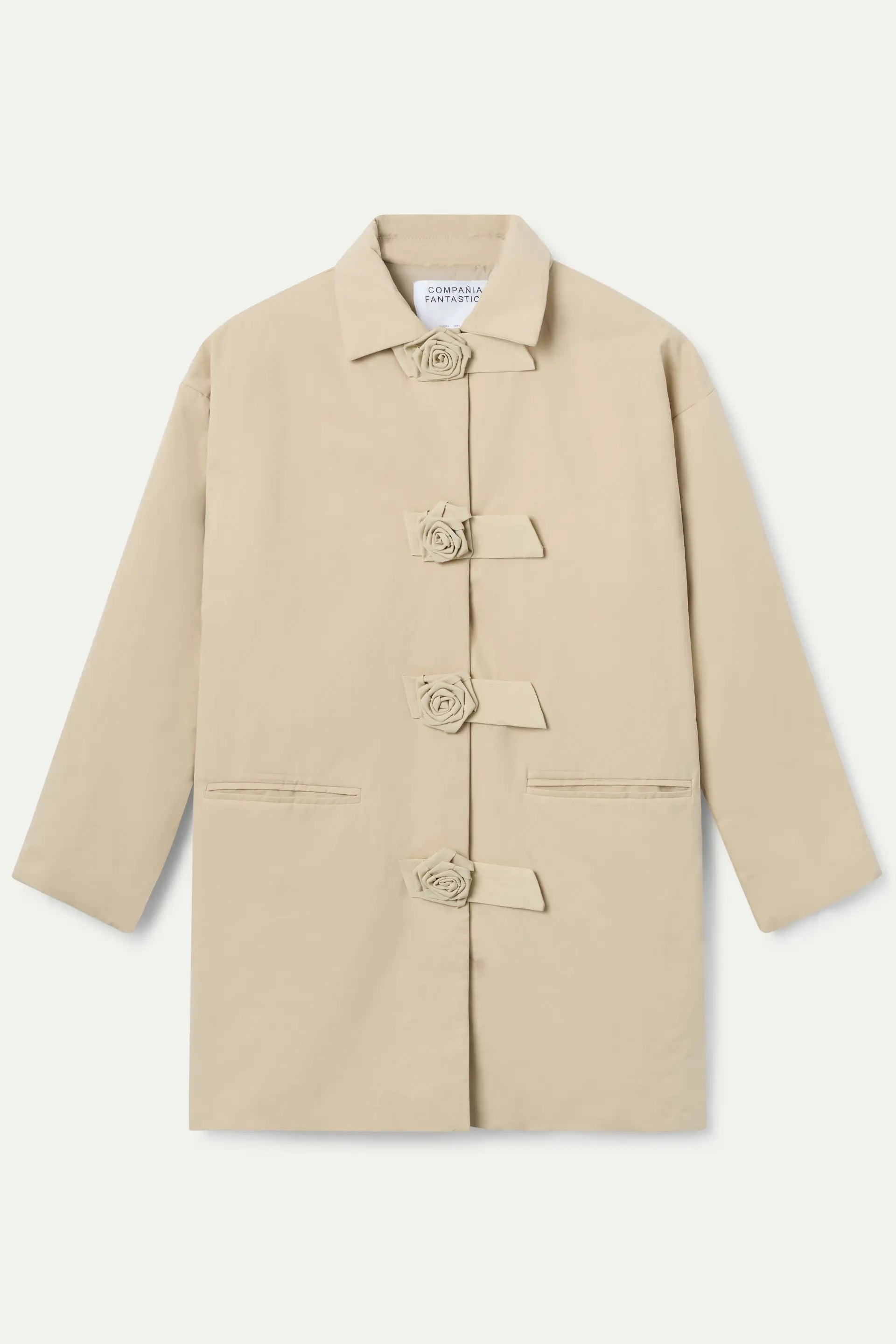 Cappotto midi beige con collo a revers e maniche lunghe. Chiusura con bottoni nascosti e dettaglio floreale. Spalle leggermente scese. La modella è alta 177 cm e indossa una taglia S.