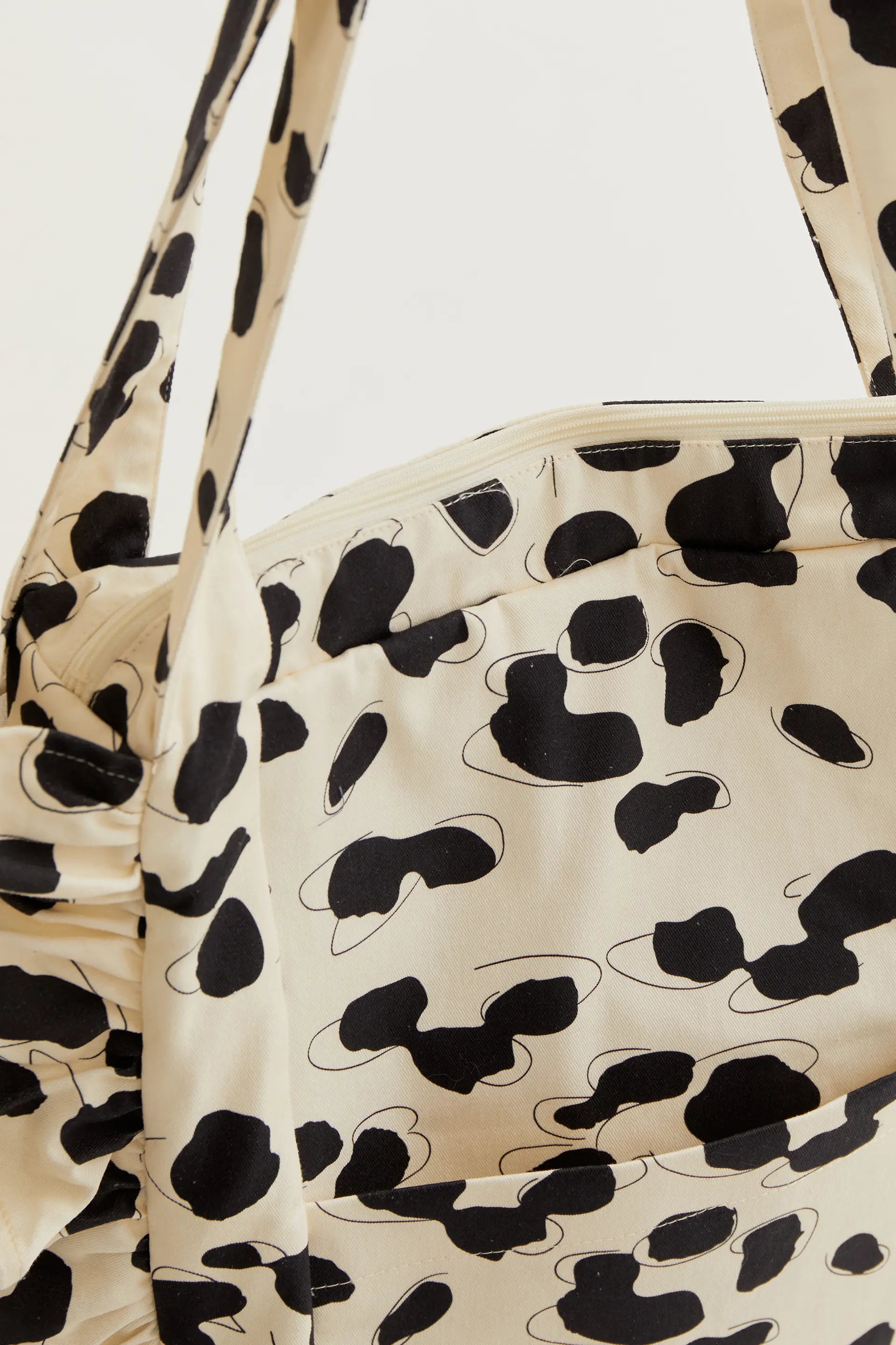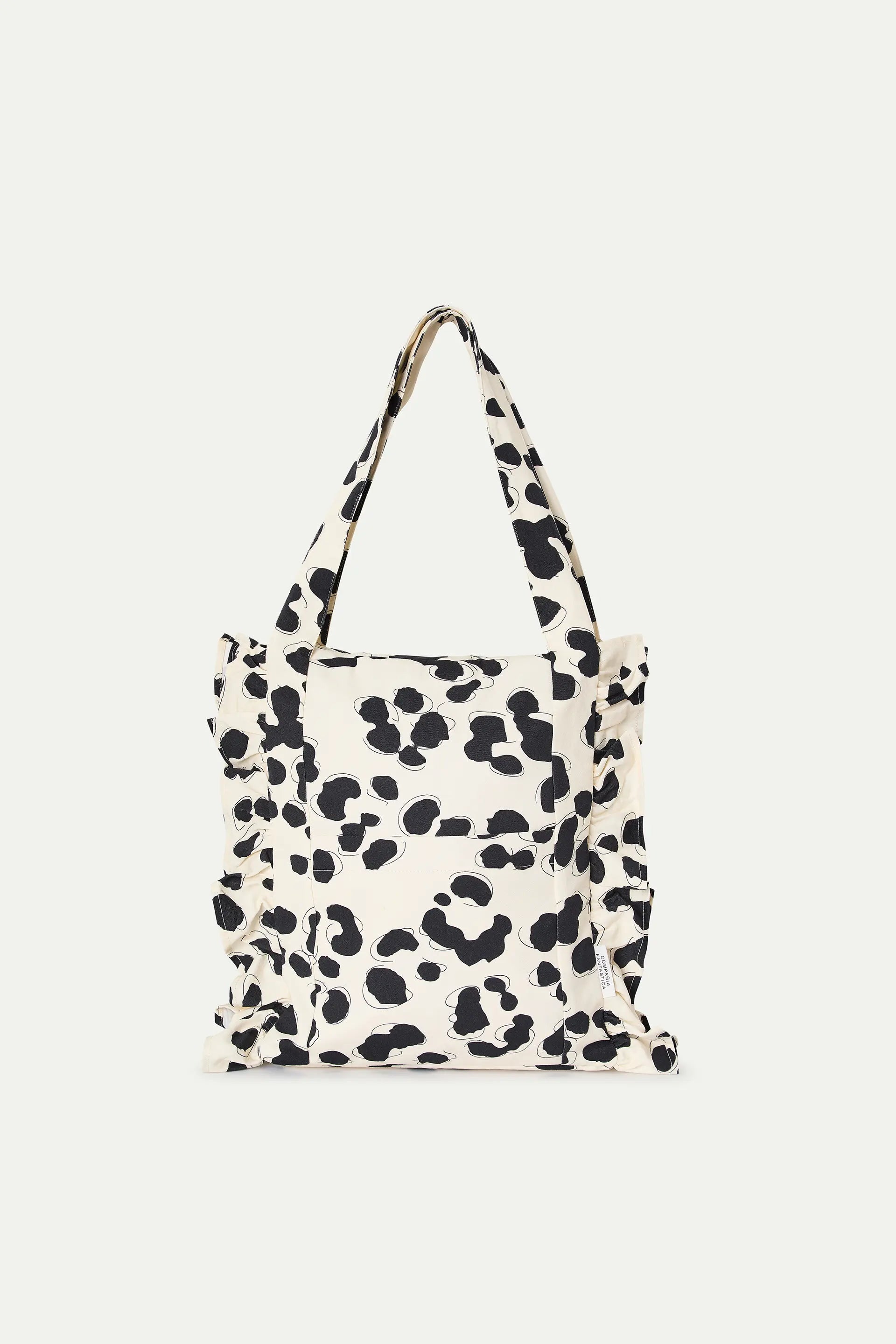 Borsa in tessuto 100% cotone con stampa dalmata. Manico corto. Chiusura con cerniera. Tasca frontale. Dettaglio volant. Interno foderato.