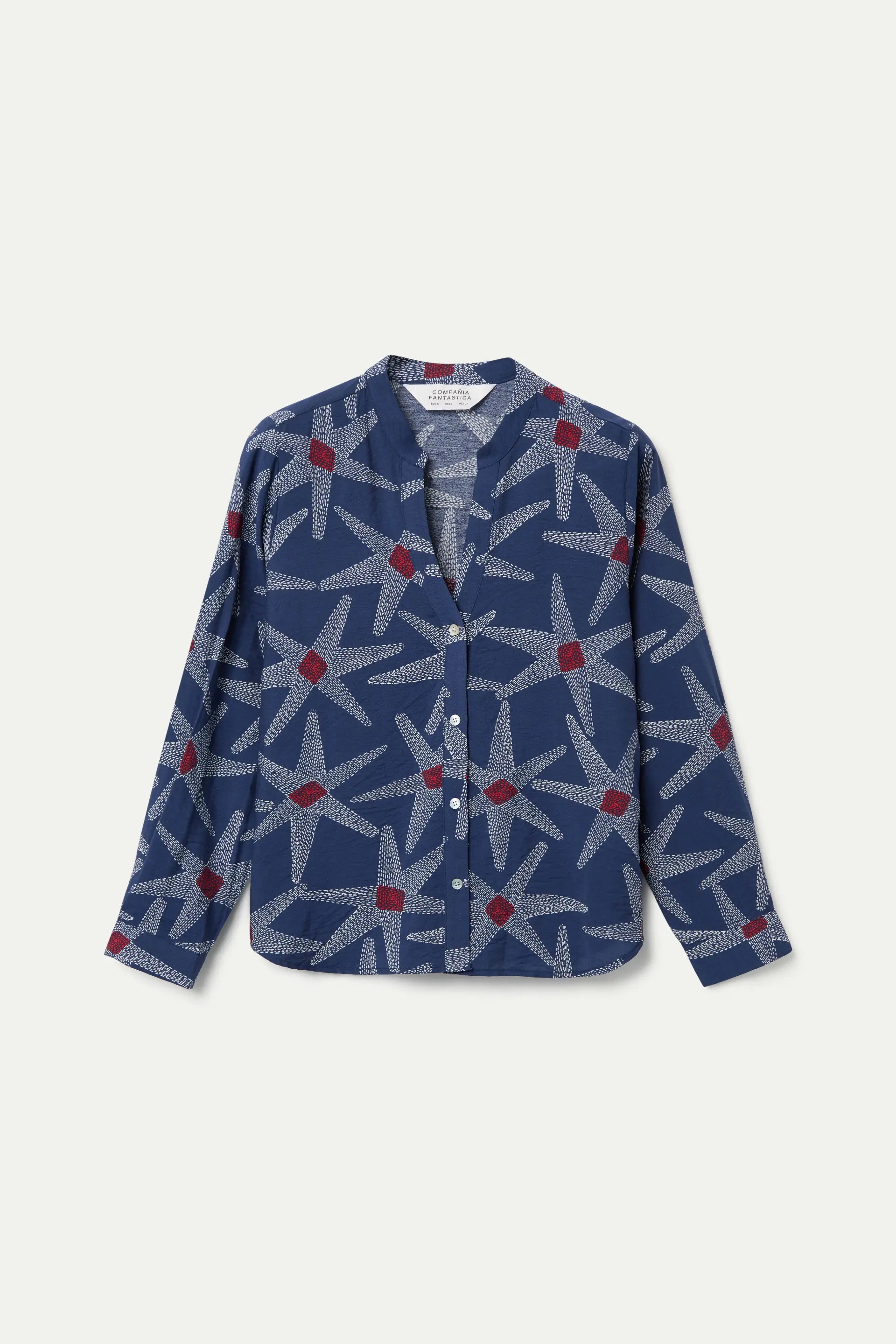 Camicia in crêpe leggera con stampa Starship. Scollo rotondo a V e maniche lunghe con polsini abbottonati. Chiusura frontale con bottoni. La modella è alta 174 cm e indossa una taglia S.