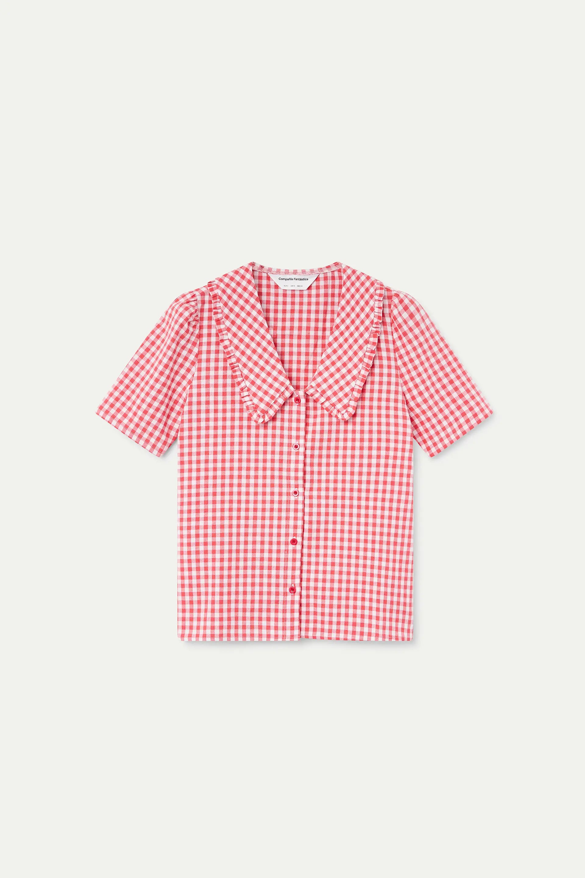 Camicia a quadretti rossi realizzata in 100% cotone. Colletto alla Peter Pan e maniche corte. Chiusura frontale con bottoni rossi. La modella è alta 175 cm e indossa una taglia S.