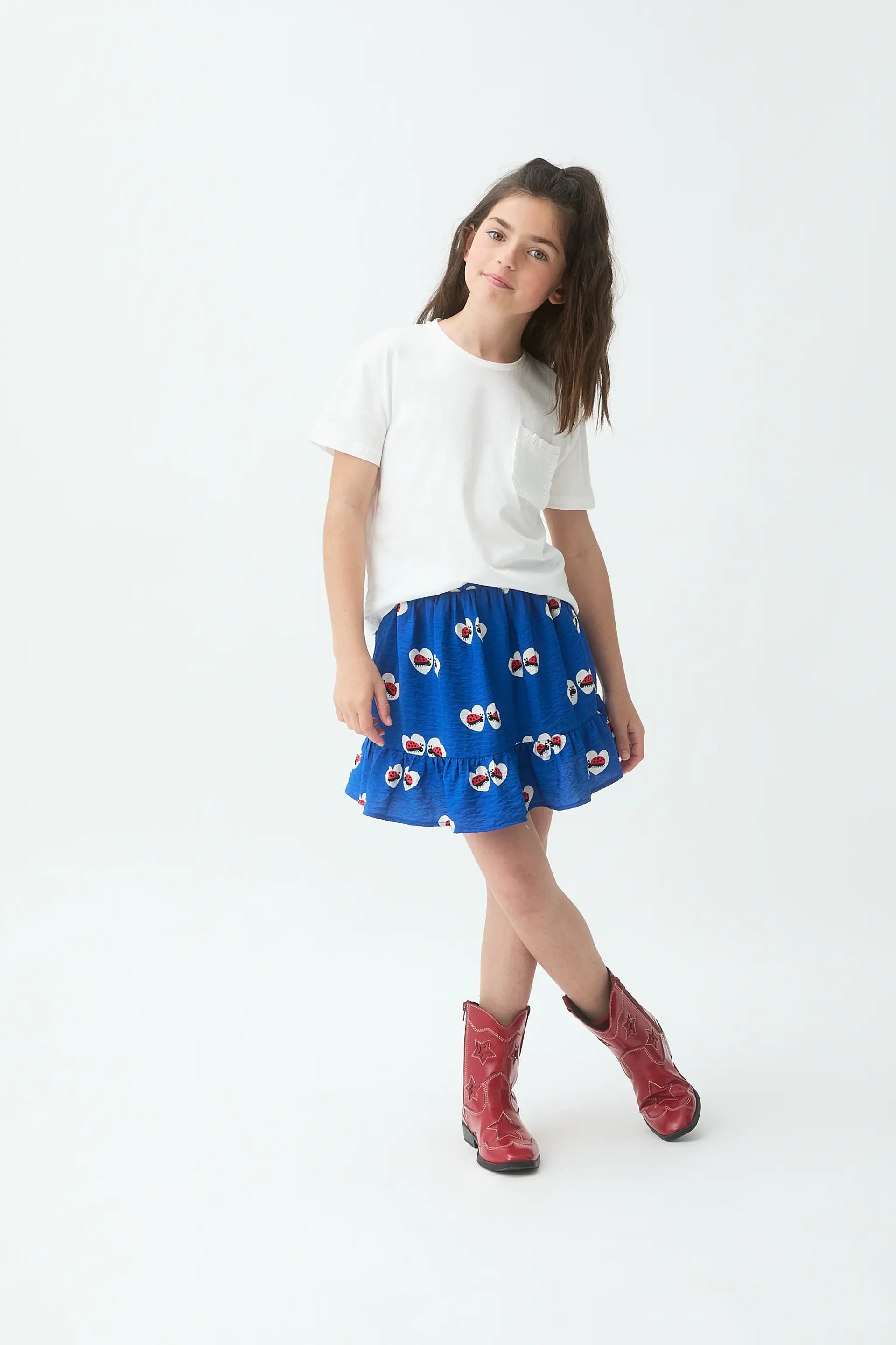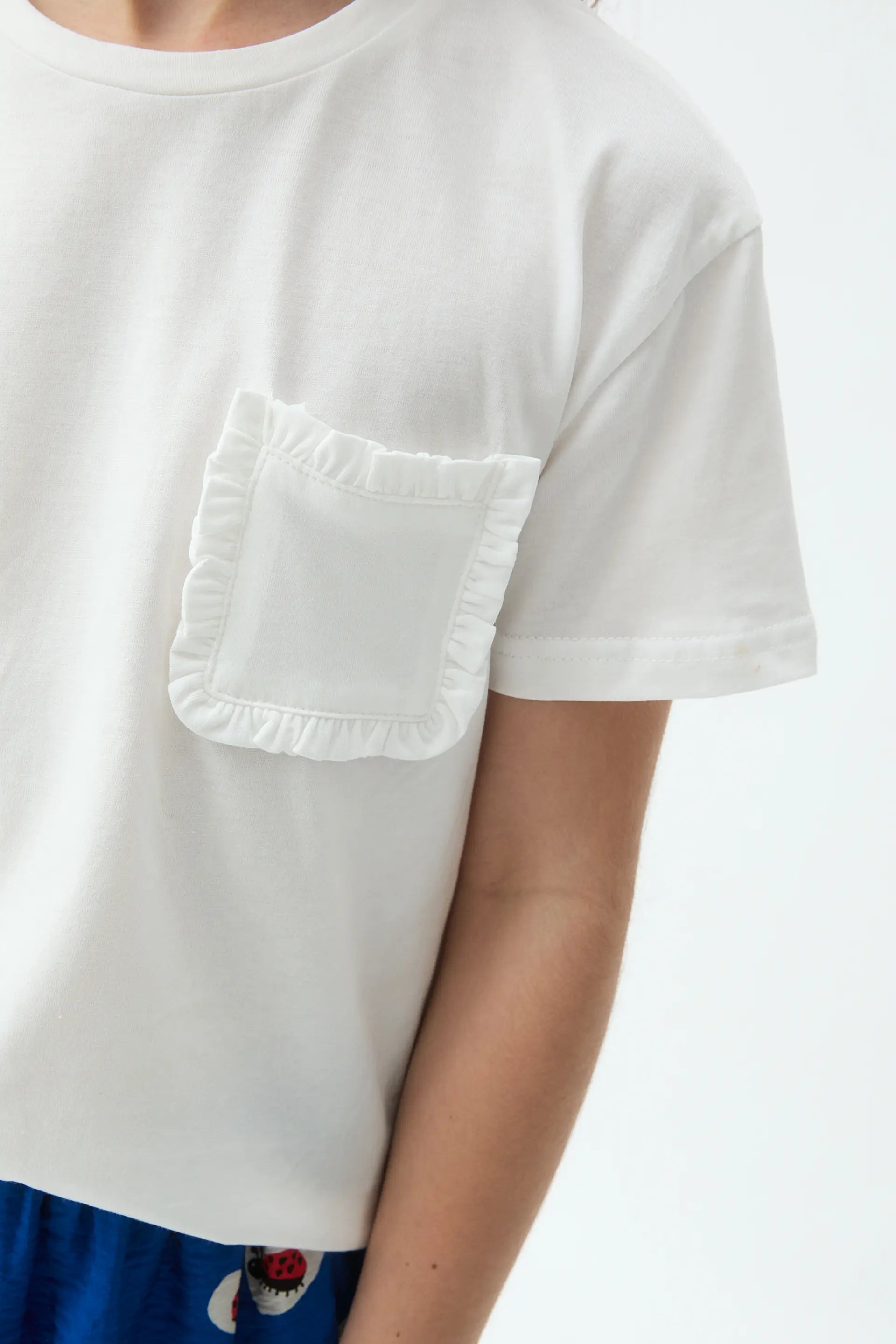 T-shirt bianca da bambina realizzata in 100% cotone. Presenta scollo rotondo, maniche corte e tasca frontale con dettagli sfrangiati. La modella è alta 135 cm e indossa una taglia 8-9 anni.