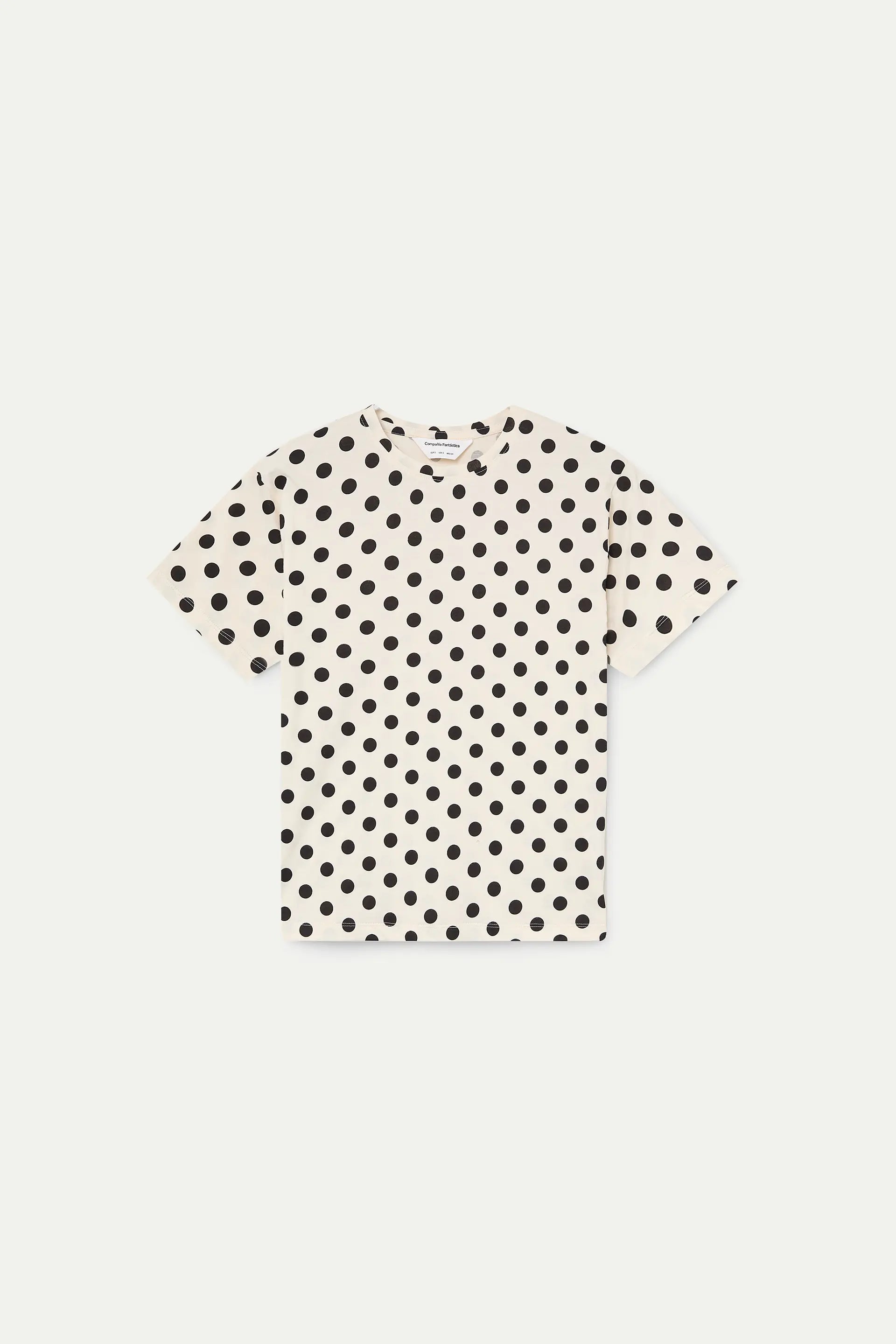 T-shirt 100% cotone con stampa a pois neri. Scollo rotondo e maniche corte. La modella è alta 177 cm e indossa una taglia S.