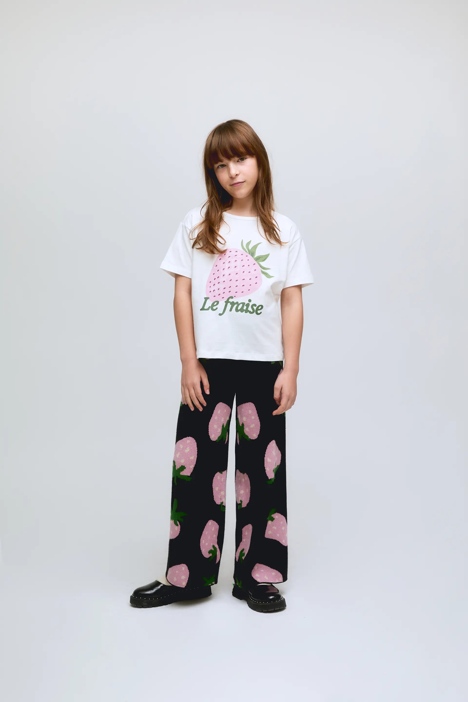 Maglietta bianca a maniche corte da bambina con stampa di fragole.