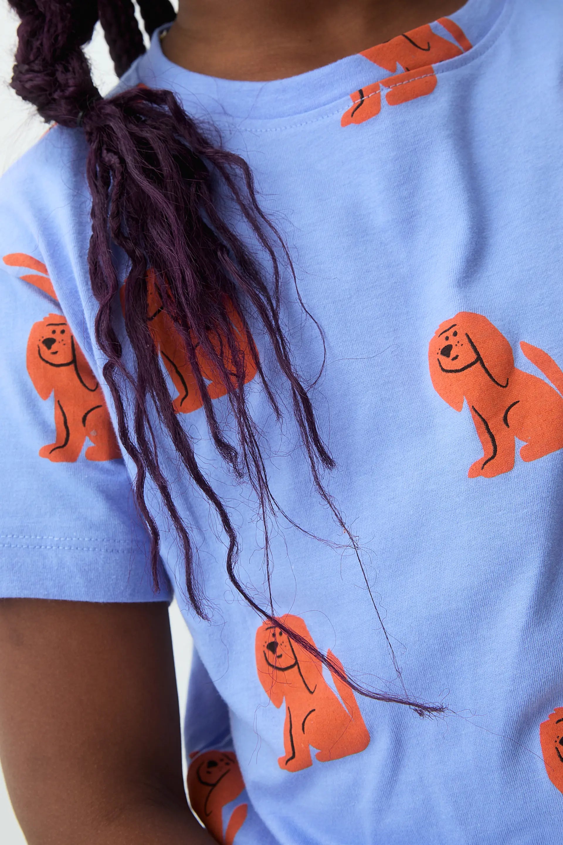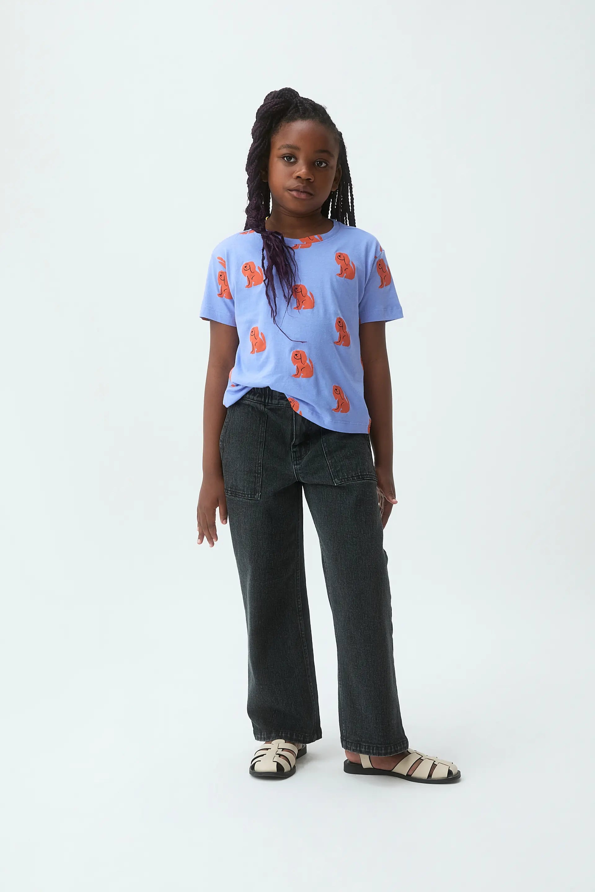 T-shirt da bambina in 100% cotone, blu con stampa di un cucciolo. Scollo rotondo e maniche corte. La modella è alta 133 cm e indossa una taglia 8-9 anni.