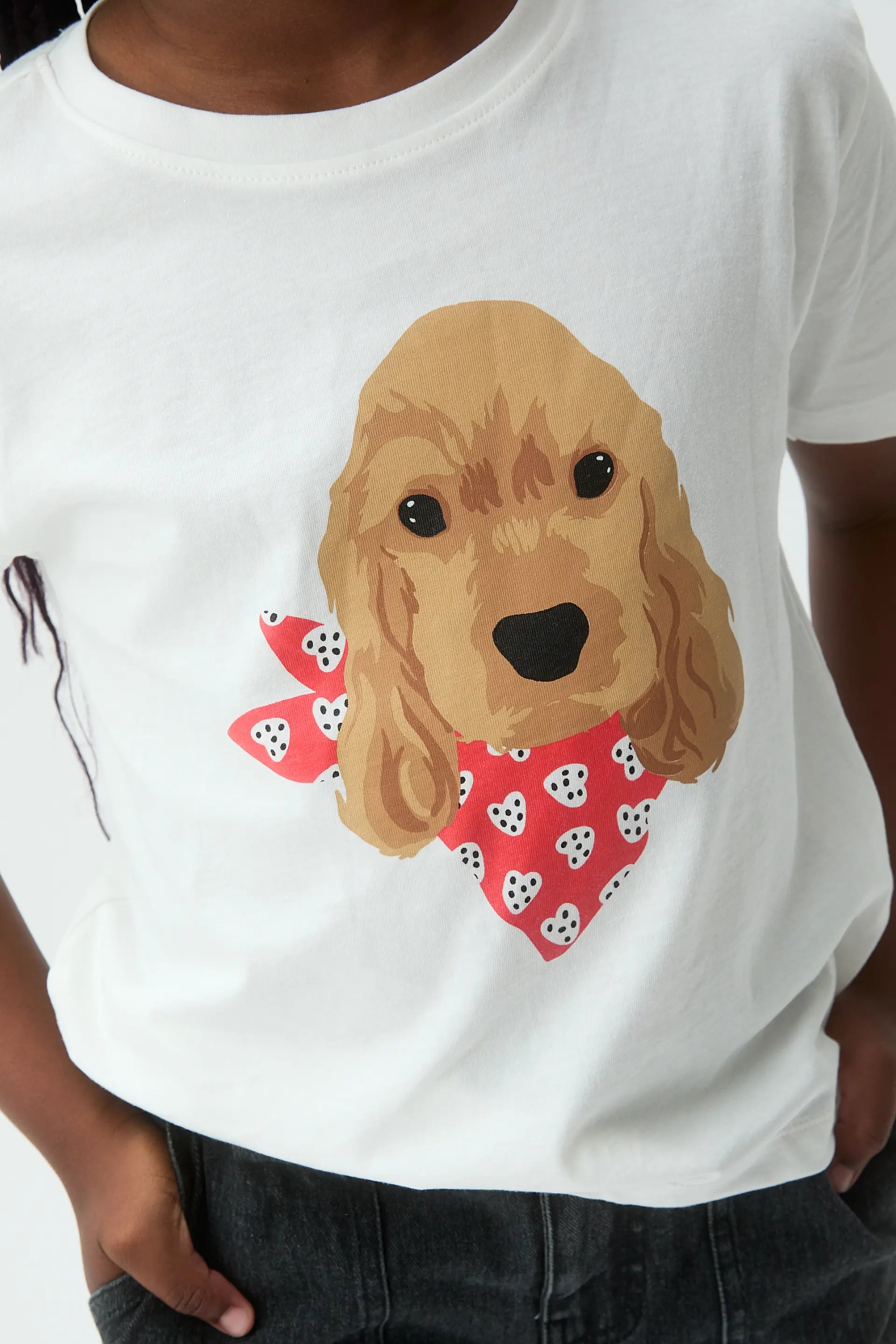T-shirt da bambina in 100% cotone con stampa di un cocker spaniel. Scollo rotondo e maniche corte. La modella è alta 133 cm e indossa una taglia 8-9 anni.