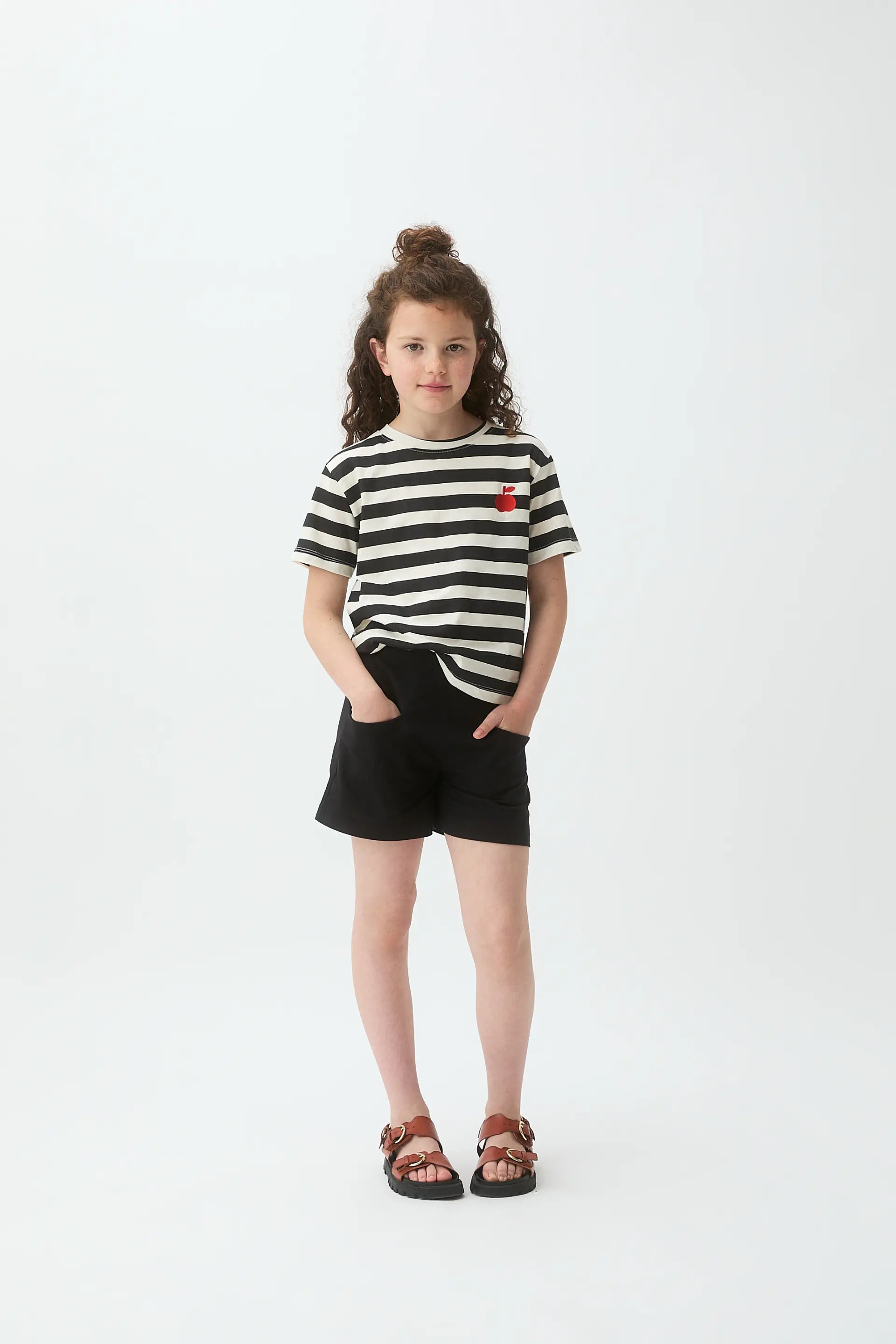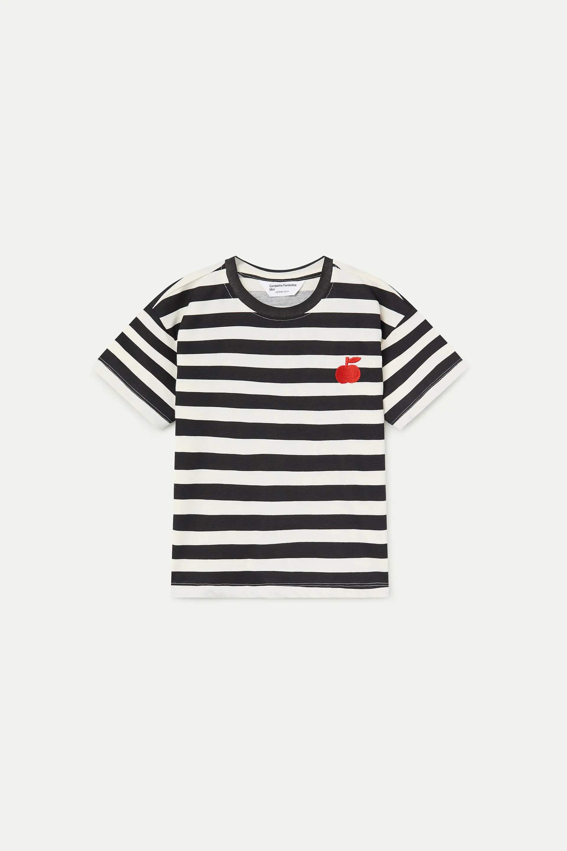 T-shirt da bambina in 100% cotone con stampa a righe bianche e nere e mela ricamata. Scollo rotondo e maniche corte. La modella è alta 134 cm e indossa la taglia 8-9 anni.
