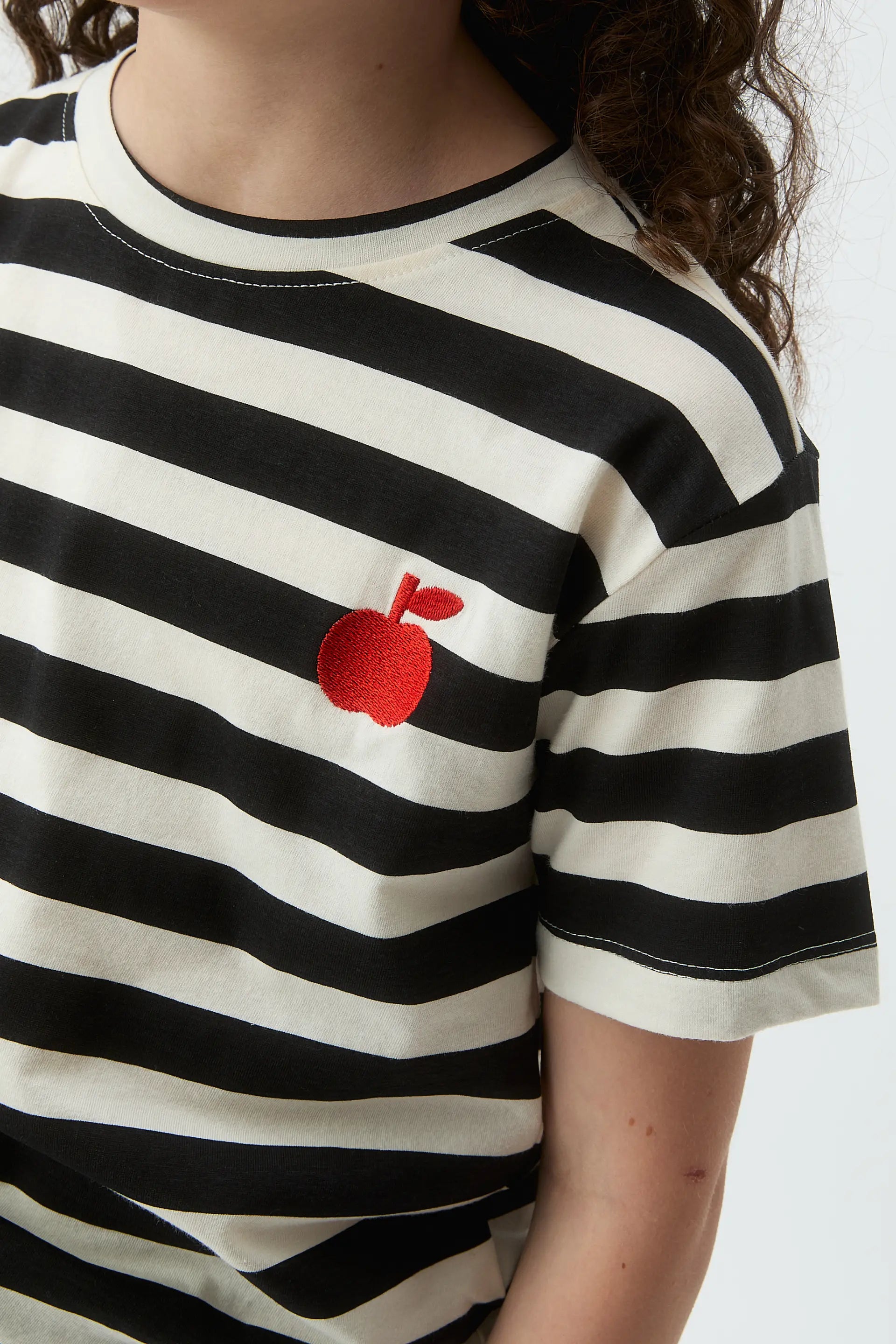 Maglietta da bambina con stampa a righe nere e ricamo di mele