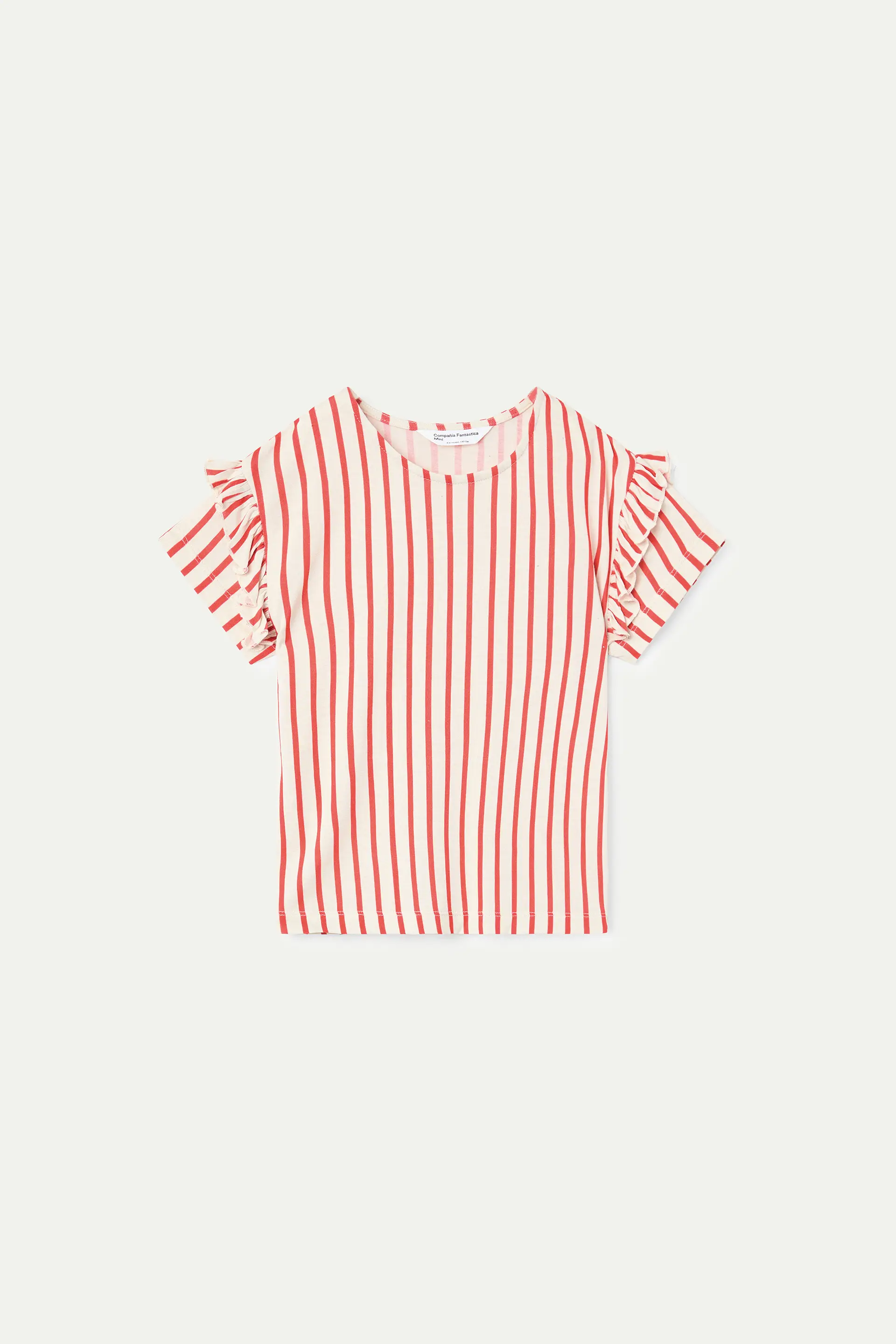 T-shirt da bambina con stampa a righe rosse. Scollo rotondo e maniche corte. Spalle leggermente scese con dettagli a balze. La modella è alta 133 cm e indossa la taglia 8-9 anni.